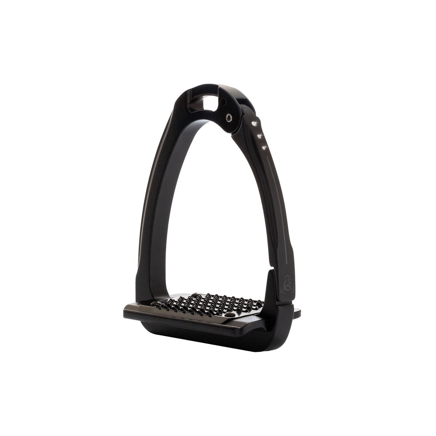 De brede roestvrijstalen antislip beugelzool heeft een grof profiel en extra lange gaten voor de afvoer van zand en water. De beugelzool is licht gekanteld, zodat de hak omlaag wordt gehouden. De afgeschuinde stijgbeugelriemophanging zorgt voor een goede beugelpositie, waardoor de voet in de juiste positie gehouden wordt. Dit geeft de ruiter meer stabiliteit en verbetert de beenligging.