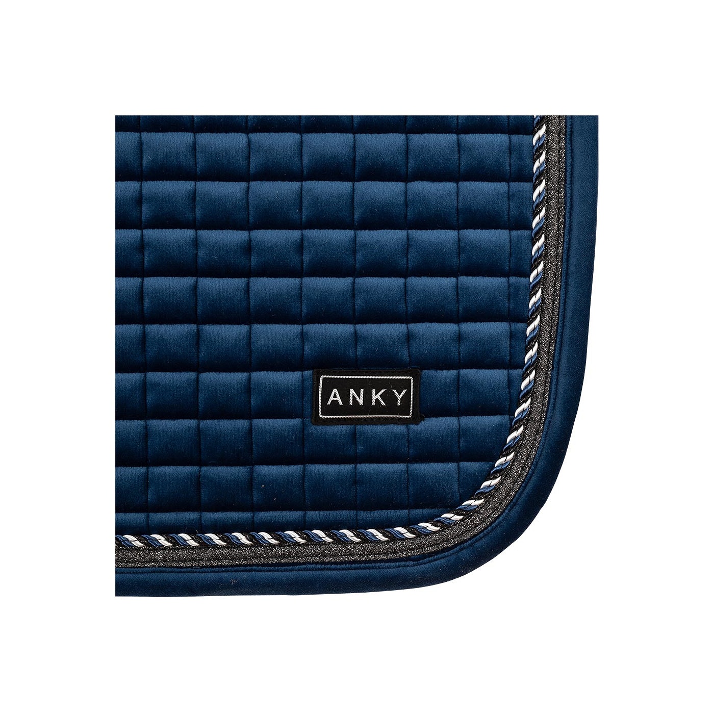 De Velvet pad heeft een mooie vierkante stepping en is afgewerkt met een koordbies en een glitterbies. De buitenzijde van fluweel voelt heerlijk zacht aan en geeft de pad een luxueuze uitstraling. De pad is gelijkmatig gevuld met een synthetische padding voor een goede schokdemping. ANKY® pads staan erom bekend dat ze perfect op hun plek blijven liggen, snel drogen en lang mooi blijven.