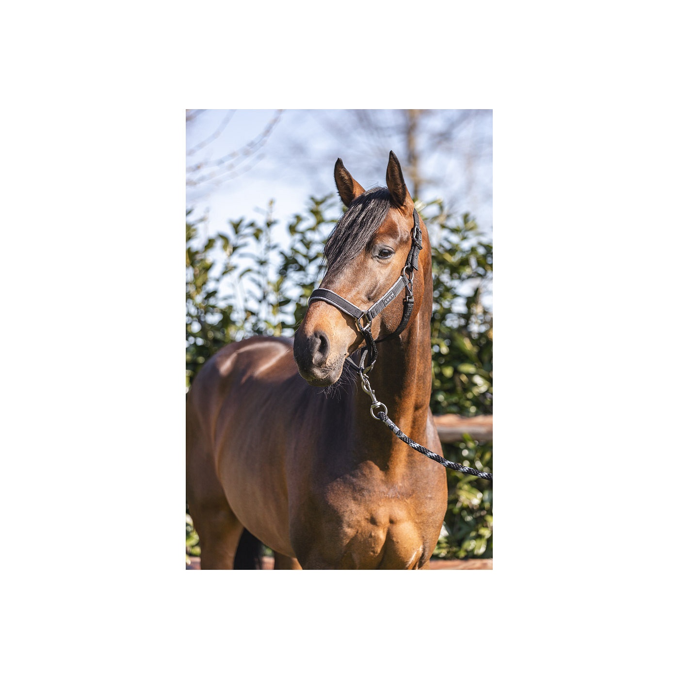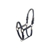 Het is gemaakt van polyester banden en de stevige, donkere fournituren van nikkel geven het halster een elegante look.