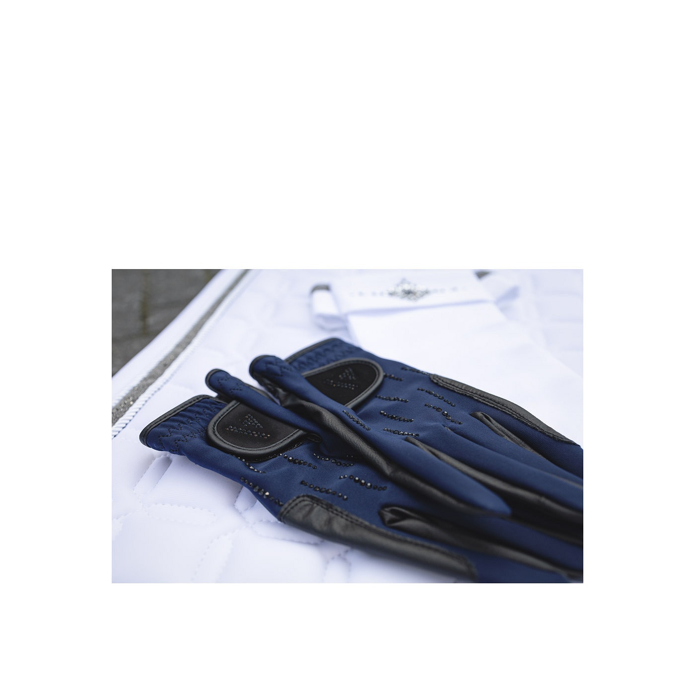 De palmzijde van de handschoenen is gemaakt van bedrukt synthetisch leer met teugelversterking voor een goede grip. De rugzijde van de handschoen is verfraaid met zwarte, kleine strass-steentjes voor een licht glanzend effect. Ook op de verstelbare klittenbandsluiting zijn de zwarte strass-steentjes te vinden in de vorm van het ANKY®-logo.