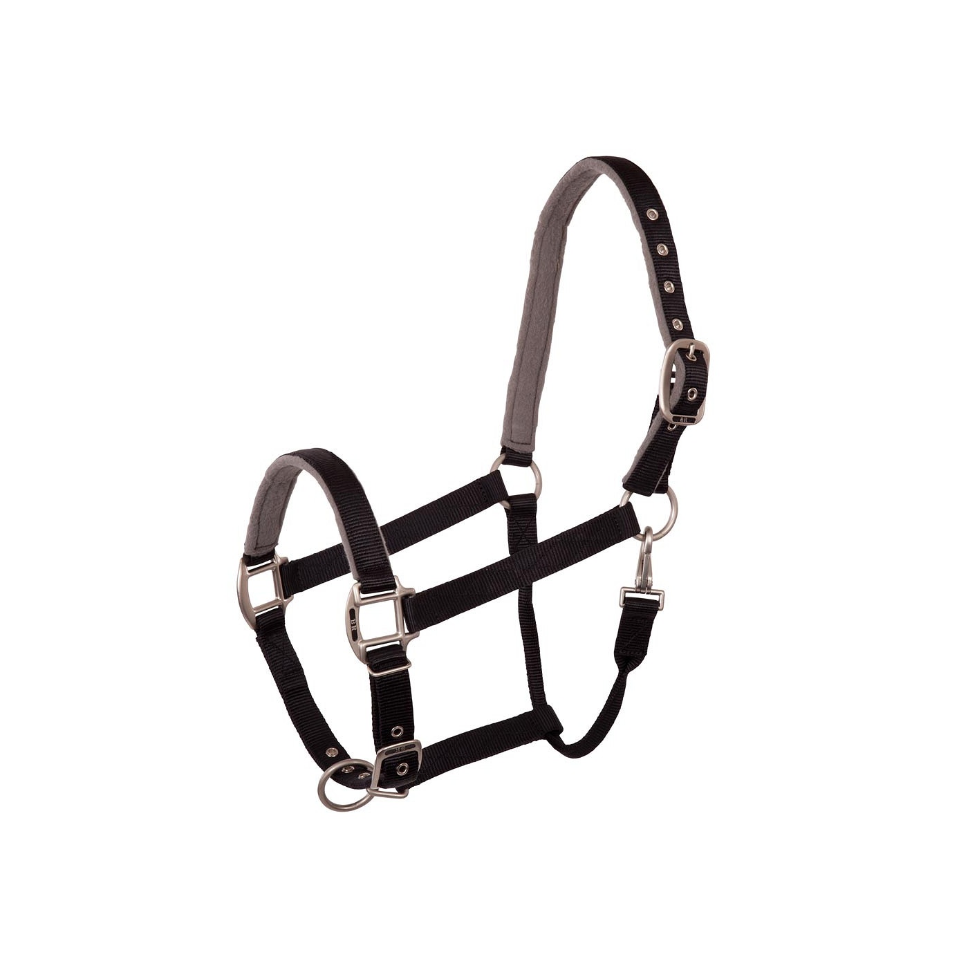 Nylon halster met zachte fleece voering in het kopstuk en de neusriem. Neus- en halsriem zijn verstelbaar. Voorzien van mat zilveren fournituren.