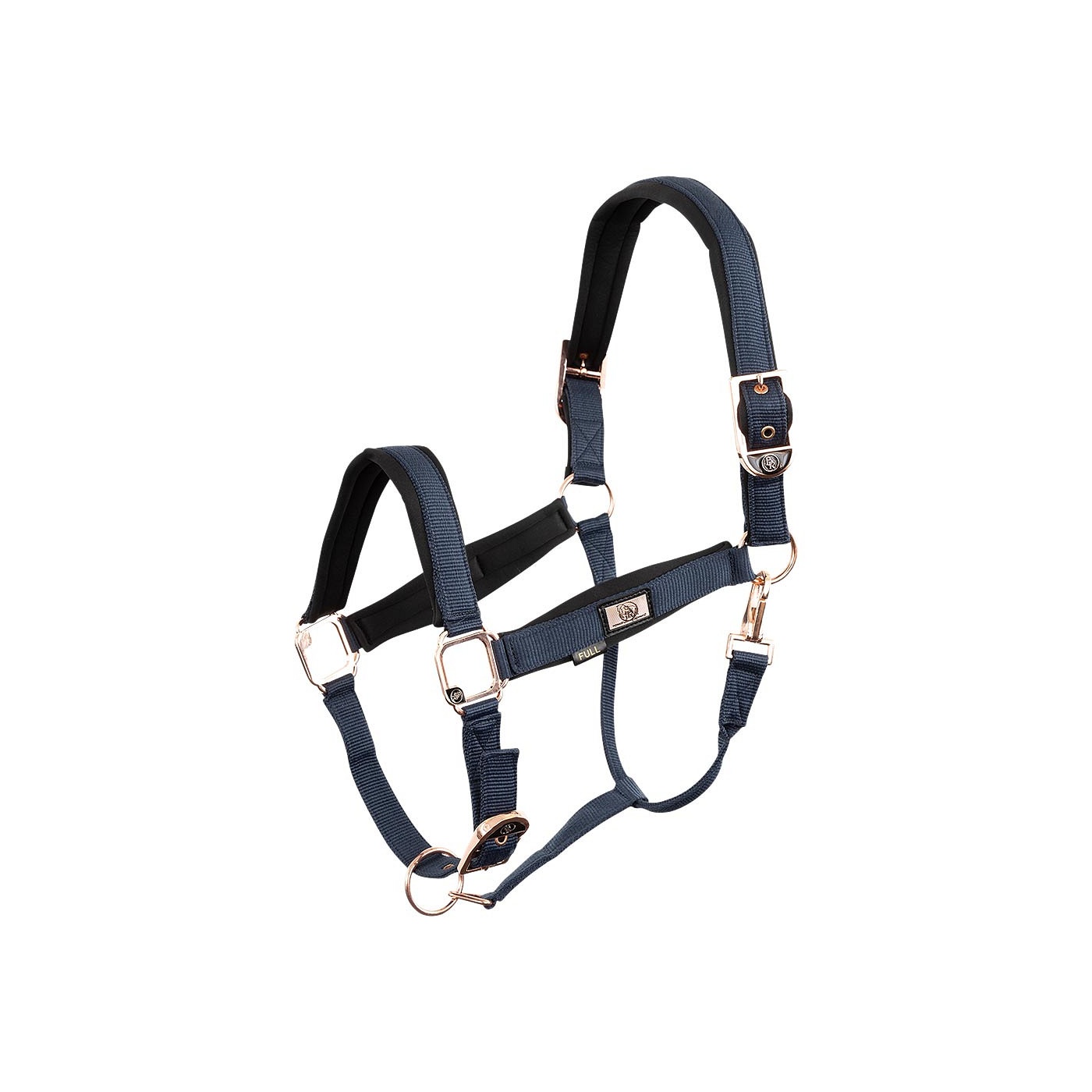 Dit mooie halster met roségouden fournituren is voorzien van een zachte voering van neopreen op het kopstuk, de bakstukken en de neusriem. Dit maakt het halster aangenaam voor je paard. Het kopstuk is verstelbaar aan beide zijden voor een goede pasvorm en ook de neusriem is verstelbaar. Het rosékleurige metalen plaatje op beide bakstukken maakt het halster op stijlvolle wijze af.