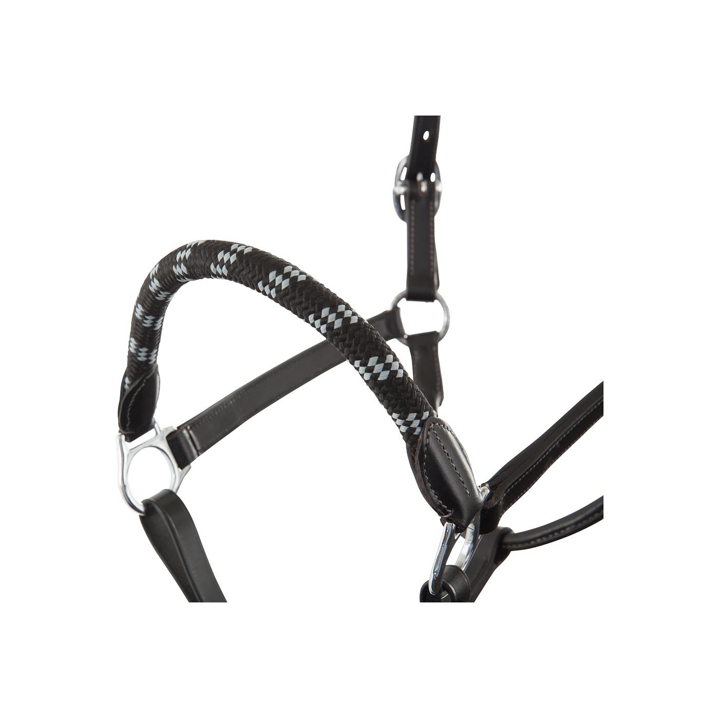Chique, lederen halster met ronde Nylon neusriem en rond Nylon lijn. Het kopstuk is met zacht leder gevoerd en met rond gevormde gespen aan beide zijden verstelbaar. De rondgenaaide keelriem kan losgemaakt worden met behulp van een quick release clip. De neusriem is aan één zijde verstelbaar. Het halster is uitgerust met glanzende, zilverkleurige fournituren van verchroomd messing. De ronde Nylon lijn heeft aan het eind een breed lederen handvat waardoor de lijn minder snel uit de hand glijdt.