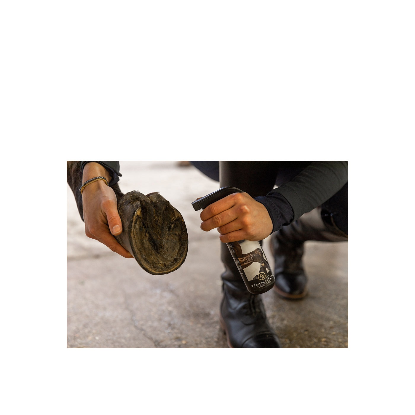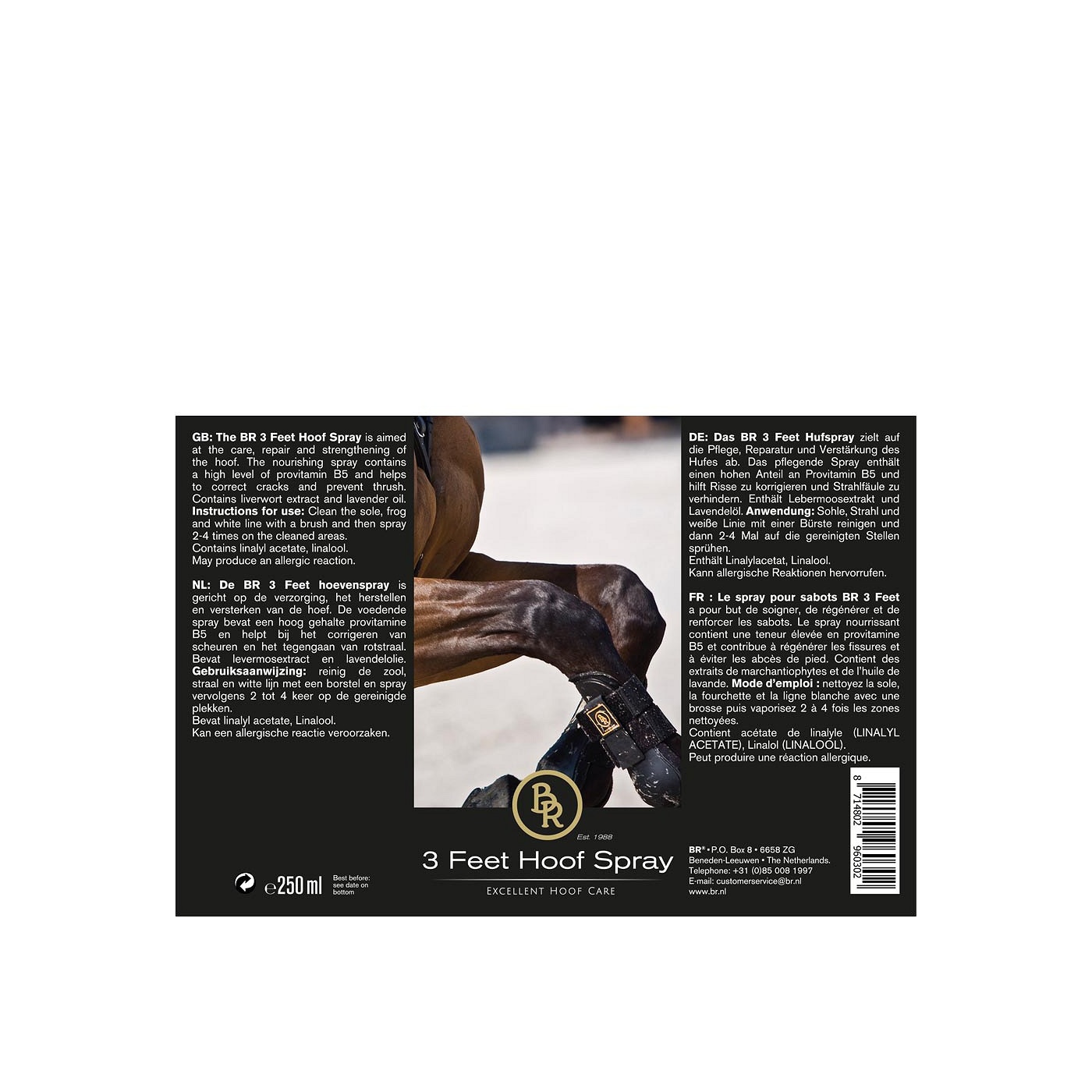 De BR 3 Feet hoevenspray is gericht op de verzorging, het herstellen en versterken van de hoef. De voedende spray bevat een hoog gehalte provitamine B5 en helpt bij het corrigeren van scheuren en het tegengaan van rotstraal. Bevat levermosextract en lavendelolie.
