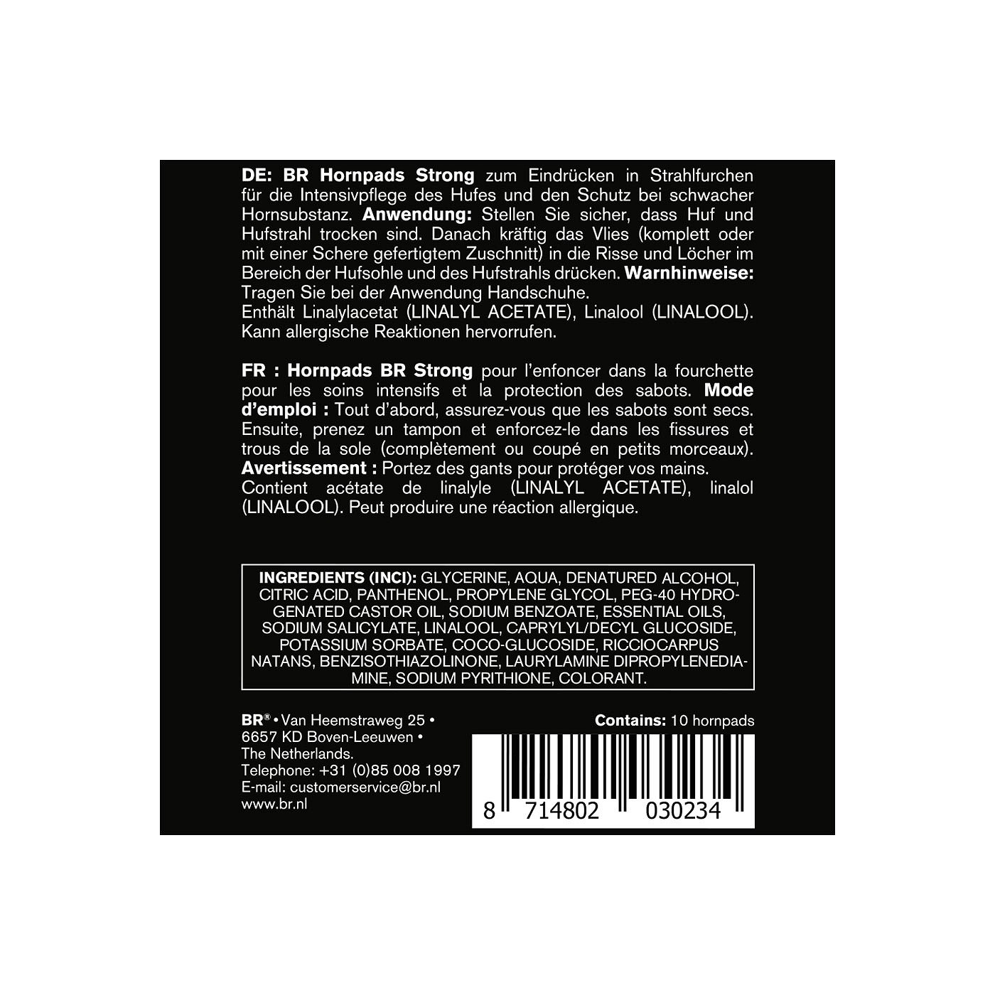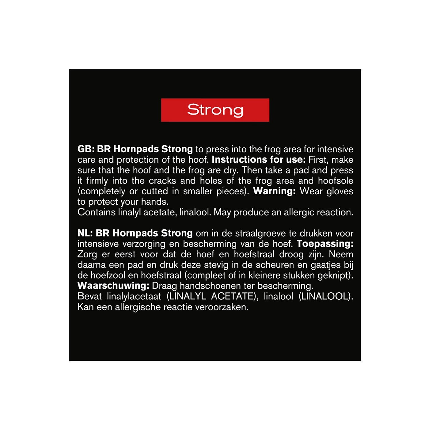 De BR Hornpads Strong zijn vochtige pads met verzorgende eigenschappen om in de straalgroeve te drukken voor intensieve verzorging van de hoef en bescherming tegen infecties. Inhoud: 10 stuks.