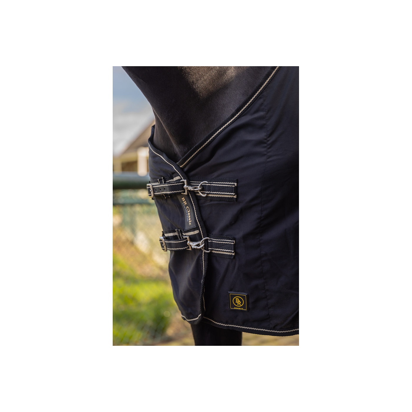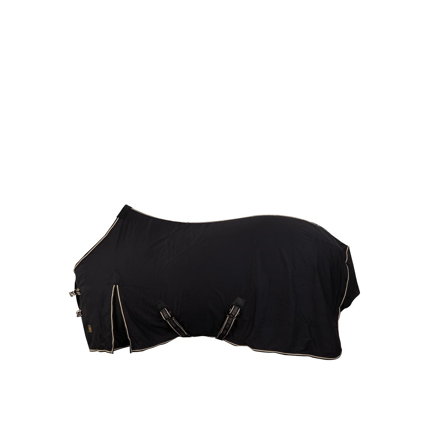 Deze anatomisch gevormde deken is vervaardigd van sterk polykatoen (65% katoen, 35% polyester). Bij de borst is de deken verstevigd met een extra laag polykatoen. De deken is voorzien van een verstelbare, dubbele borstsluiting met quick release clips en klittenband. Daarnaast heeft de deken een dubbelgestikte rugnaad met een bies en een fleece schoftbeschermer. De buiksingel is extra verstevigd dankzij de Pu patch van synthetisch leder. Verder is de deken voorzien van loopsplitten; kruissingels met elastiek die zowel verstelbaar als afneembaar zijn en verstelbare, afneembare, elastische bilkoorden. De deken is uitgerust met fournituren van zink met een matte, zilverkleurige finish. Machinewasbaar op 30°C.
