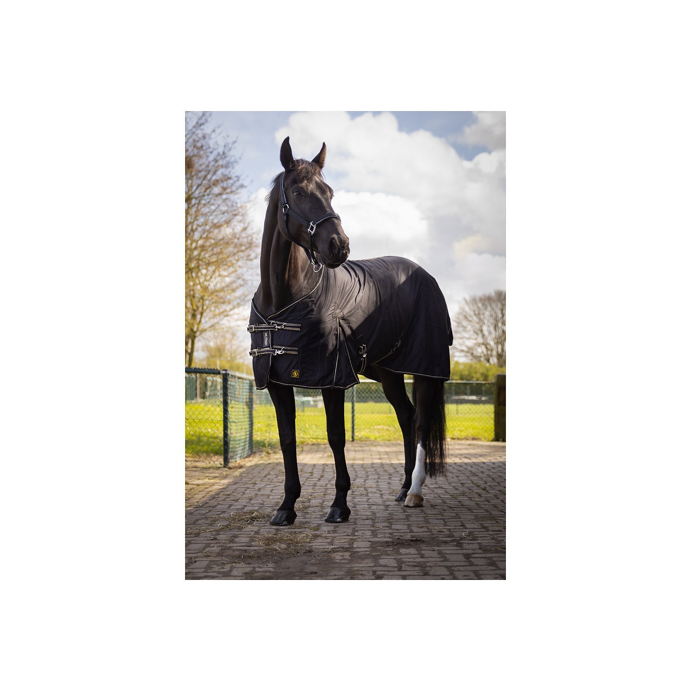 Deze anatomisch gevormde deken is vervaardigd van sterk polykatoen (65% katoen, 35% polyester). Bij de borst is de deken verstevigd met een extra laag polykatoen. De deken is voorzien van een verstelbare, dubbele borstsluiting met quick release clips en klittenband. Daarnaast heeft de deken een dubbelgestikte rugnaad met een bies en een fleece schoftbeschermer. De buiksingel is extra verstevigd dankzij de Pu patch van synthetisch leder. Verder is de deken voorzien van loopsplitten; kruissingels met elastiek die zowel verstelbaar als afneembaar zijn en verstelbare, afneembare, elastische bilkoorden. De deken is uitgerust met fournituren van zink met een matte, zilverkleurige finish. Machinewasbaar op 30°C.