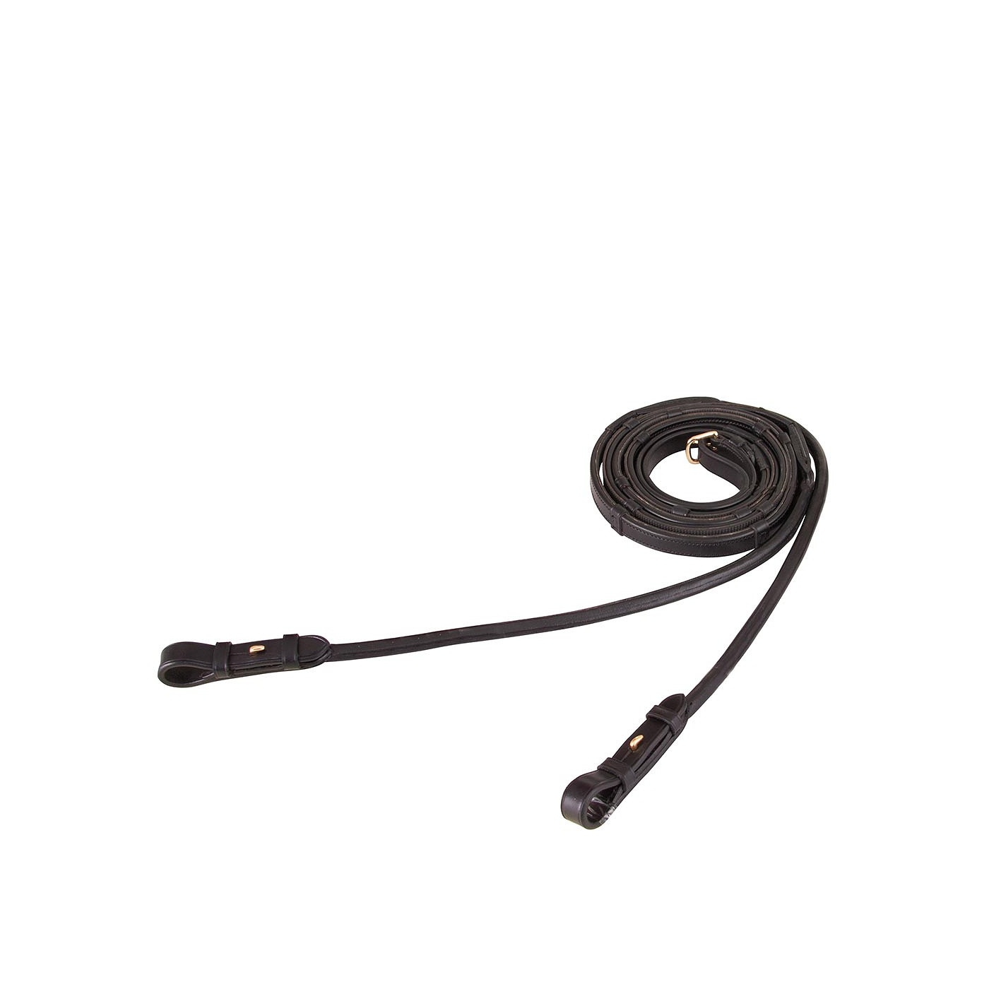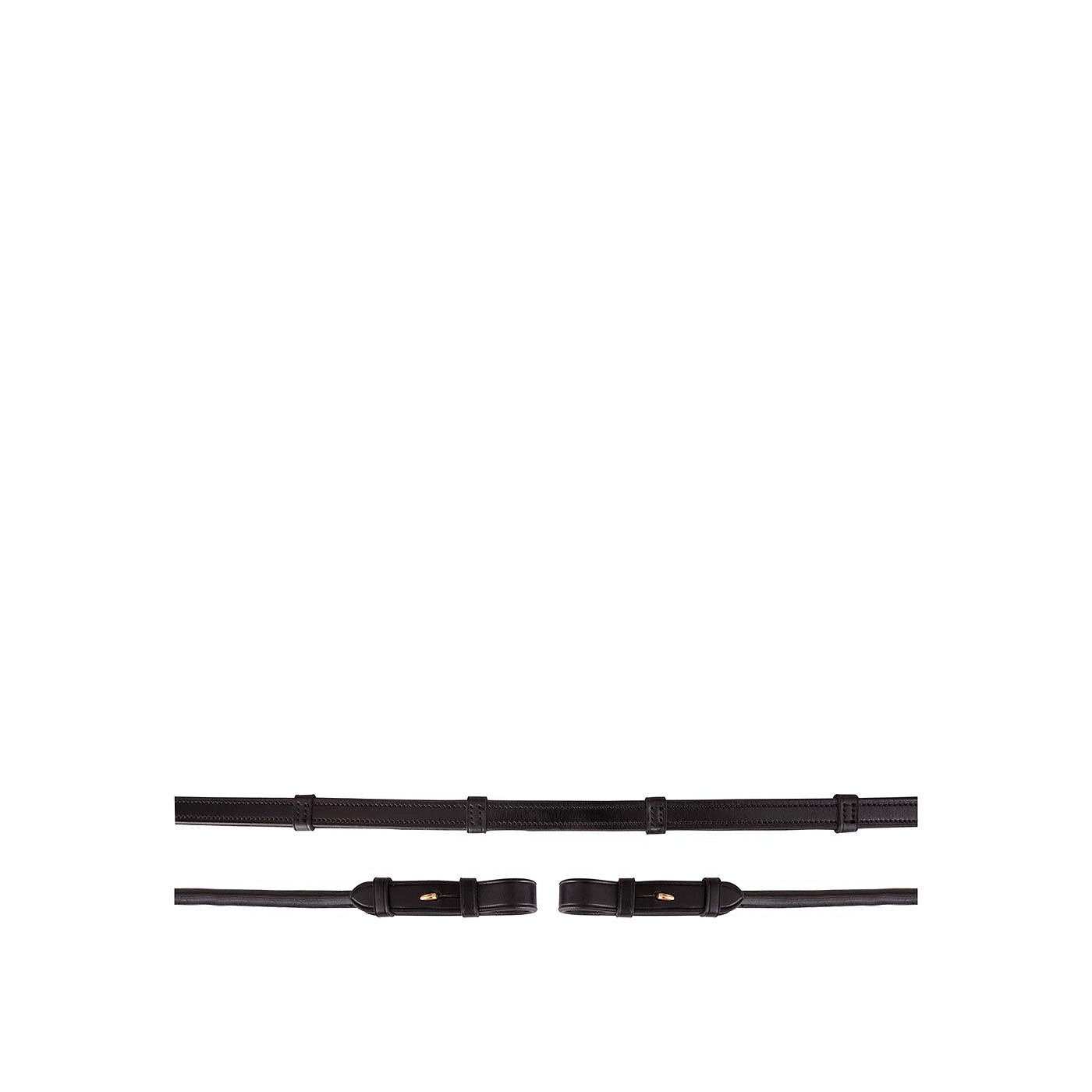 Lederen antislip teugel met rubberen binnenzijde, lederen handstops en blinde sluitingen, 16 mm. Zonder teugelstops. De uiteinden van de teugel zijn van rondgenaaid leder.