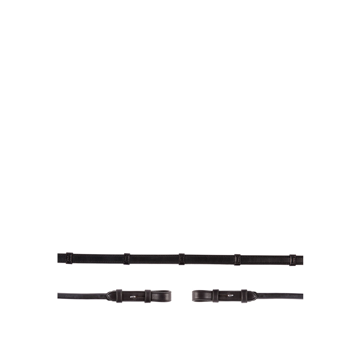 Lederen antislip teugel met rubberen binnenzijde, lederen handstops en blinde sluitingen, 16 mm. Zonder teugelstops. De uiteinden van de teugel zijn van rondgenaaid leder.