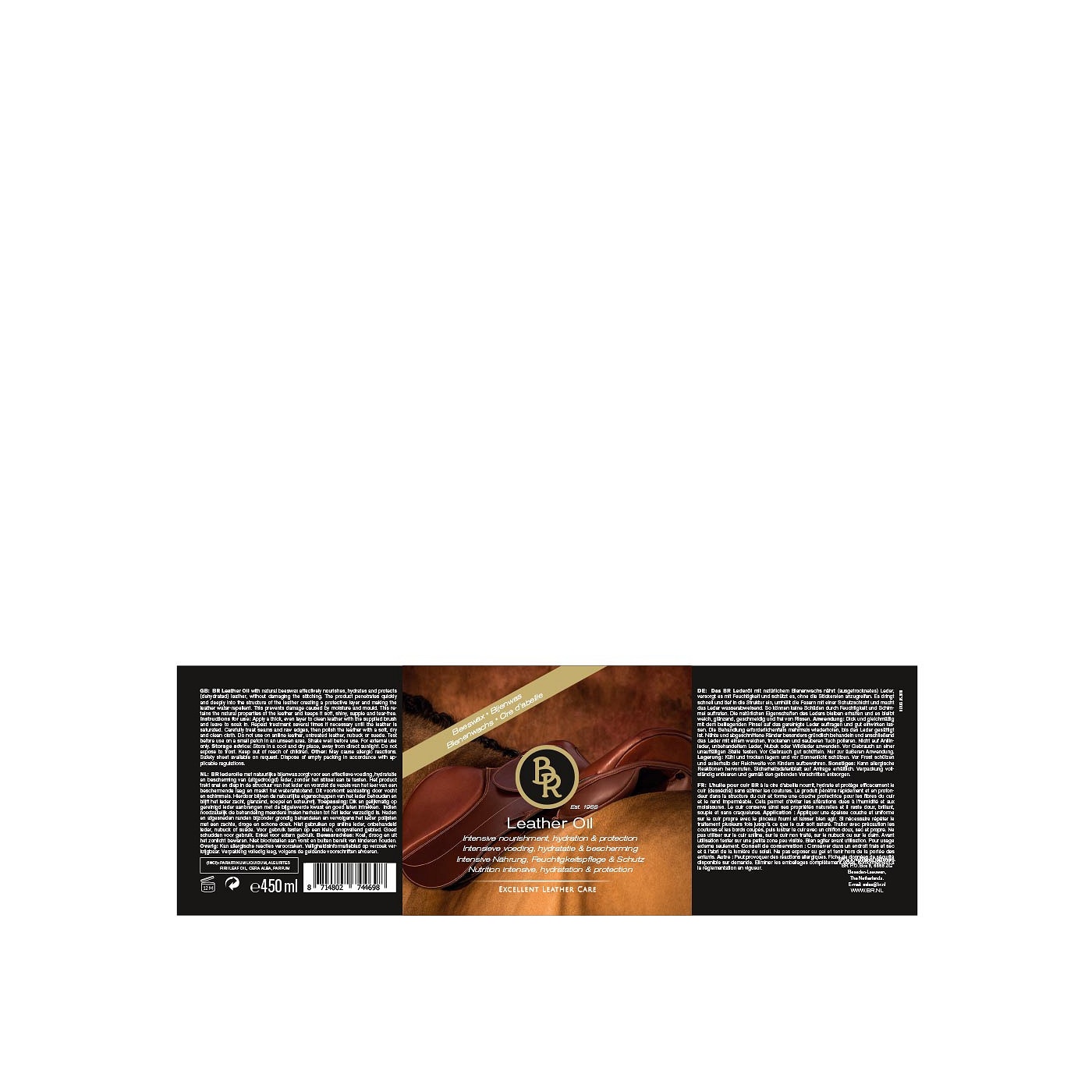 Toepassing: Dik en gelijkmatig op gereinigd leder aanbrengen met de bijgeleverde kwast en goed laten intrekken. Indien noodzakelijk de behandeling meerdere malen herhalen tot het leder verzadigd is. Naden en afgesneden randen bijzonder grondig behandelen en vervolgens het leder polijsten met een zachte, droge en schone doek. Voor een optimaal resultaat voor gebruik het leder behandelen met BR Leather Cleaner, artikel 763001. Niet gebruiken op aniline leder, onbehandeld leder, nubuck of suède. Voor gebruik testen op een klein, onopvallend gebied. Goed schudden voor gebruik. Enkel voor extern gebruik. Inhoud 450 ml.
