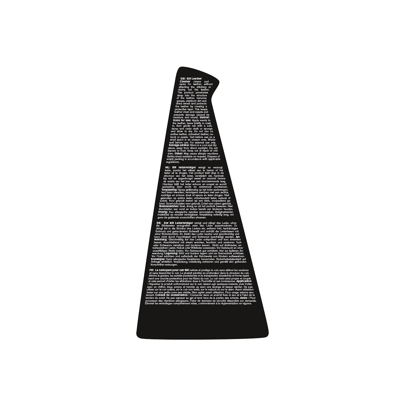 BR lederreiniger reinigt en verzorgt leder, zonder het stiksel aan te tasten of het leder uit te drogen. Het product trekt diep in de structuur van het leder, verwijdert vet, hardnekkig vuil en opgedroogd zweet en voorziet tevens de vezels van het leer van een beschermende laag. Hierdoor blijft het leder schoon en soepel en wordt aantasting door vocht en schimmels voorkomen. PH-neutraal.