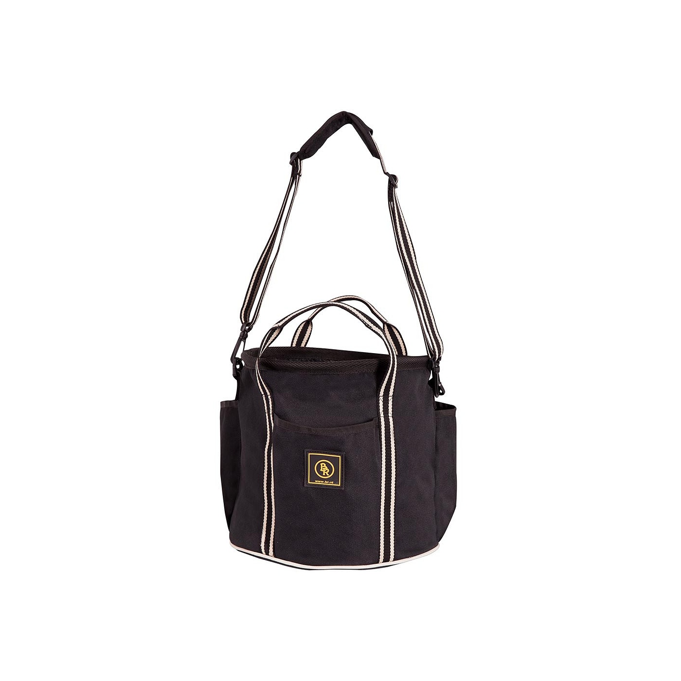 Ronde, lichtgewicht grooming bag, gemaakt van 600D polyester. De verstevigde onderzijde is voorzien van vier tasvoetjes ter bescherming. De bovenzijde is afsluitbaar met een aansnoerkoord, zodat u de inhoud kunt afdekken. De tas heeft rondom drie vakken. De tas is voorzien van handvatten en een afneembare en verstelbare schouderriem. Deze tas is zeer geschikt voor het opbergen van poetsbenodigdheden en andere stalartikelen. Afmetingen: 28 x 28 x 25 cm (l x b x h).