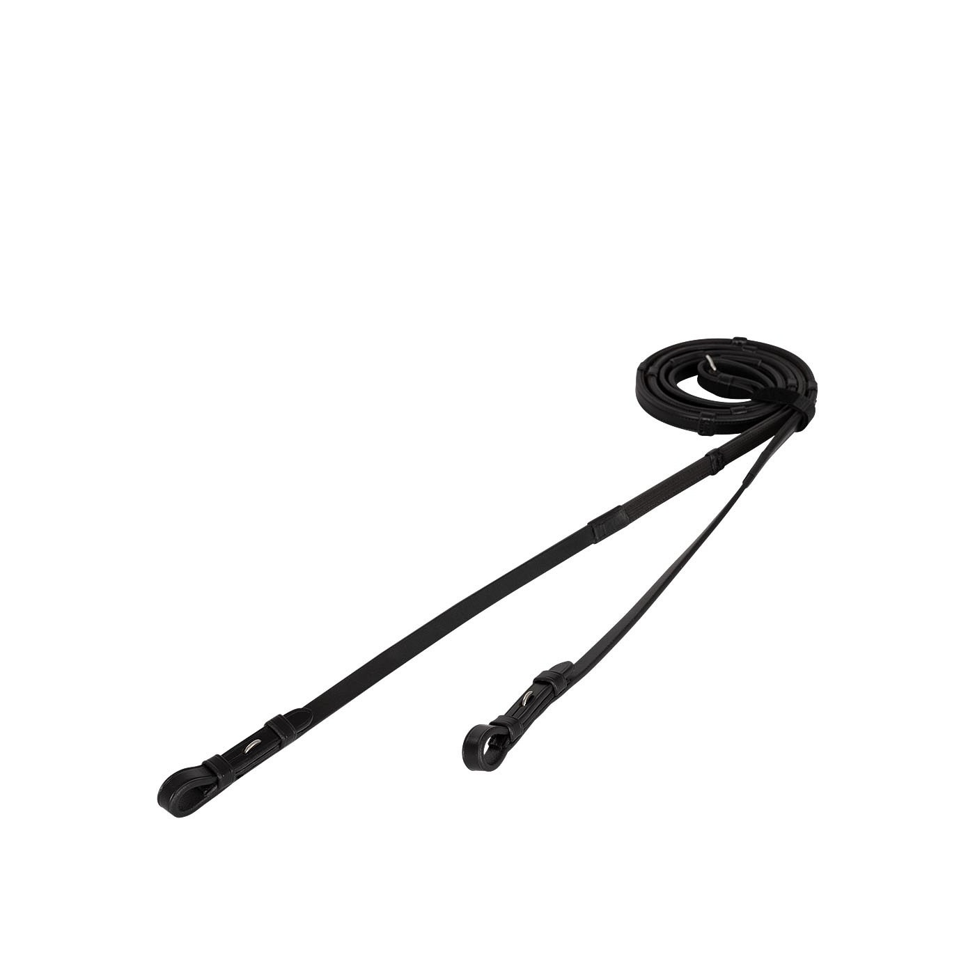 Deze rubberen/leren teugel is gemaakt van kwalitatief leder dat stevig is en lang mooi blijft. De binnenzijde is bekleed met een robuust rubberen anti-slippatroon. Daarnaast is de teugel voorzien van vijf lederen handstops aan iedere zijde en blinde sluitingen aan de uiteindes. Breedte: 13 mm (4/8”).