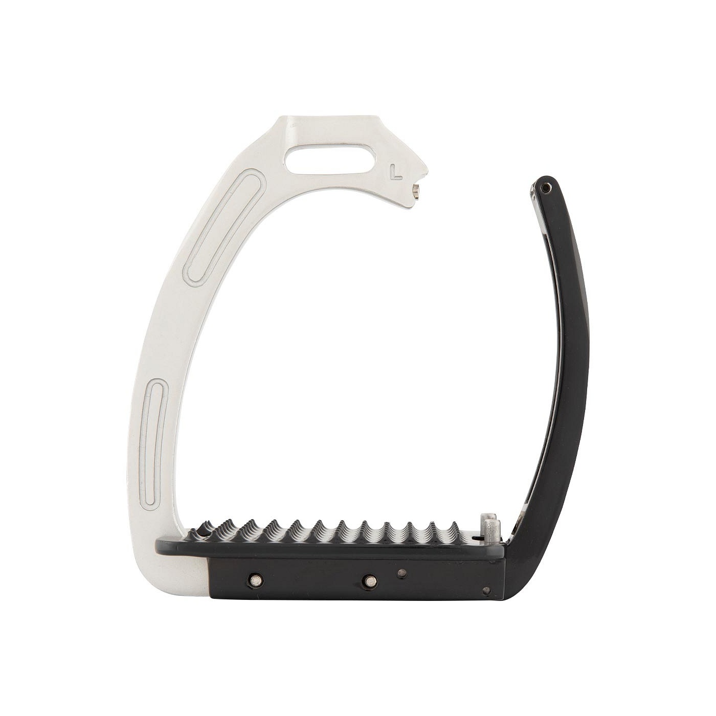 Deze stijgbeugel is gemaakt van gegalvaniseerd aluminium met een poedercoating en is aan de binnenkant versterkt met roestvrijstaal voor extra stevigheid. De beugel is uitgerust met een magnetisch veiligheidsmechanisme. Het gewicht van de ruiter zorgt ervoor dat de beugel opent bij een val. Op deze manier blijft de voet niet in de beugel hangen. Zodra de voet de beugel verlaat, sluit de beugel zich automatisch. De licht gebogen stijgbeugelriemophanging zorgt voor een goede beugelpositie, waardoor de voet in de juiste positie gehouden wordt. Dit geeft de ruiter meer stabiliteit en verbetert de beenligging.