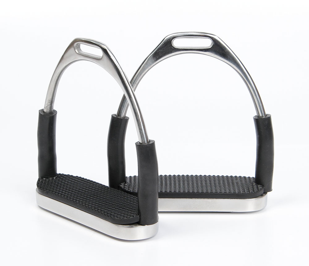 Vervaardigd van hoogwaardig RVS. Zorgt voor comfort en stabiliteit voor paard en ruiter incl. rechte, elastische zooltjes. Flexibele uitvoering met schakel aan de zijkant, waardoor de beugel flexibel is. Hierdoor gaat hij gemakkelijk uit bij een eventuele val. De beugel past zich aan aan de natuurlijke beweging van de voet, waardoor eventuele klachten aan spieren en knieÎn duidelijk worden verminderd. Optimale steun door het brede voetbed.