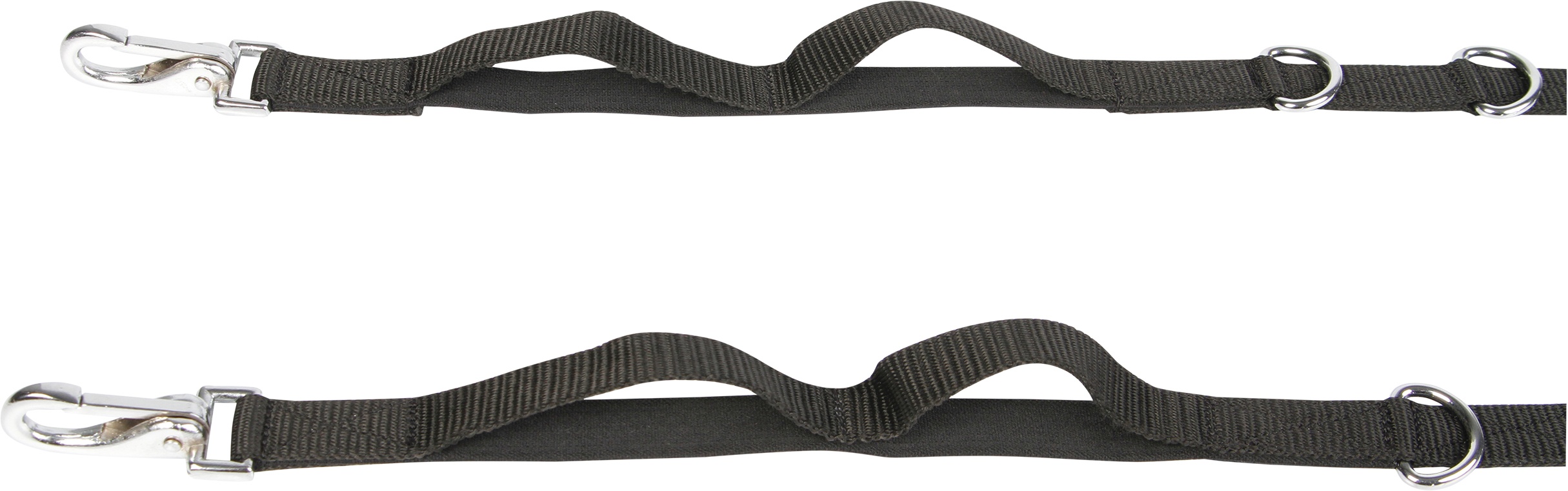 Eenvoudig verstelbare bijzetteugels door de D-ringen, te gebruiken tijdens het rijden, longeren of aan de hand werken, deels onderlegd met elastiek.