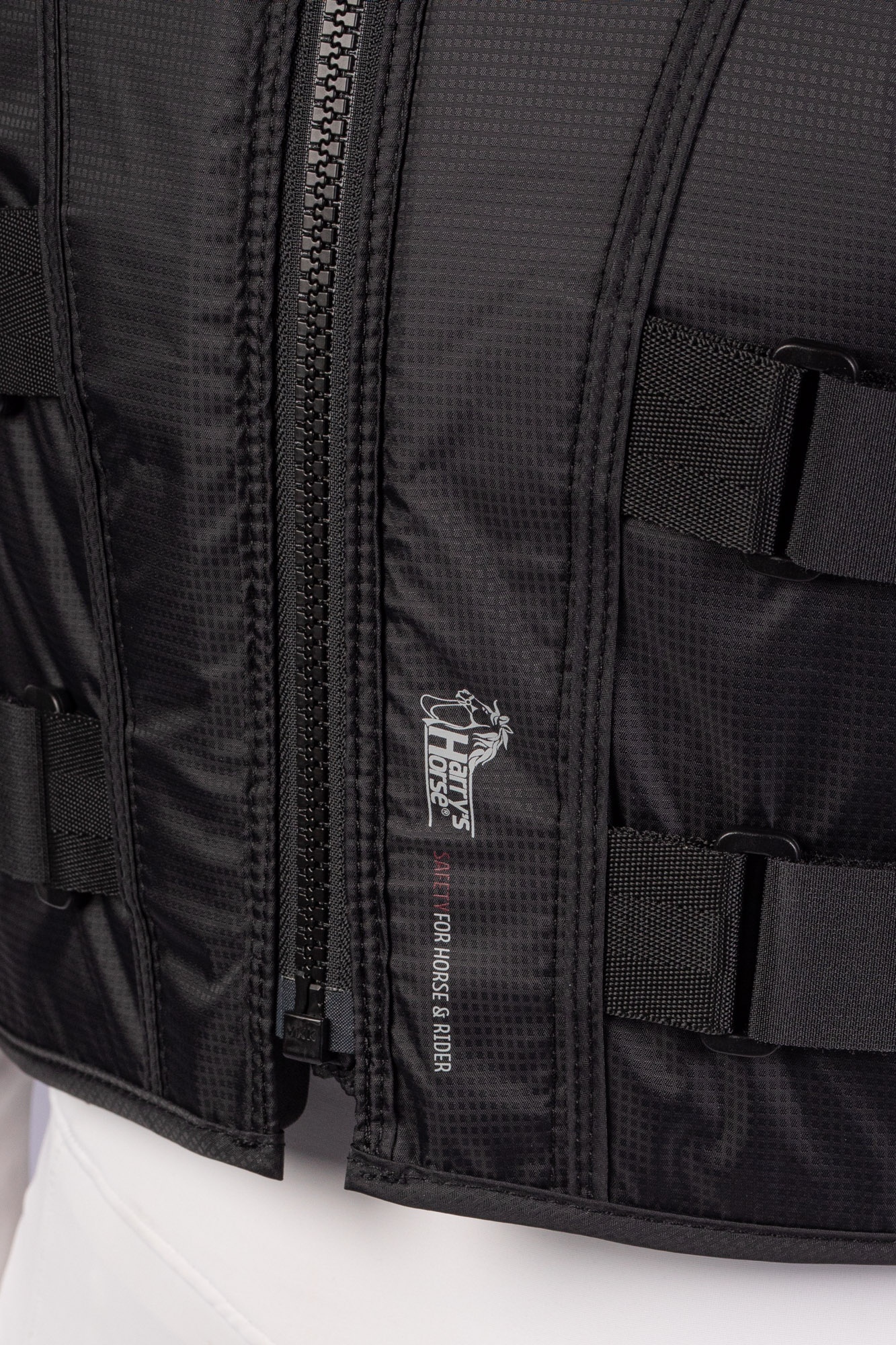 Bodyprotector welke voldoet aan de volgende internationale standaards, o.a. norm EN13158:2009 klasse 3 en BETA 2018 level 3 wat deze bodyprotector geschikt maakt voor alle officiÎle wedstrijden. Deze bodyprotector is opgebouwd uit flexibele "Soft Foam"- panelen voor een optimale pasvorm en aangenaam draagcomfort. Door het aannemen van de lichaamswarmte zal de bodyprotector nog beter aansluiten en soepeler worden. De bodyprotector is eenvoudig verstelbaar d.m.v. klittenbandsluiting op de schouders en in de taille. Voorzien van reflecterende biezen en een ritssluiting aan de voorzijde. Materiaal: Polyester Voering: Polyester/nylon Fill: High density foam