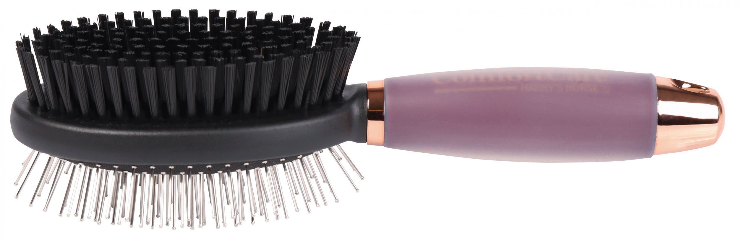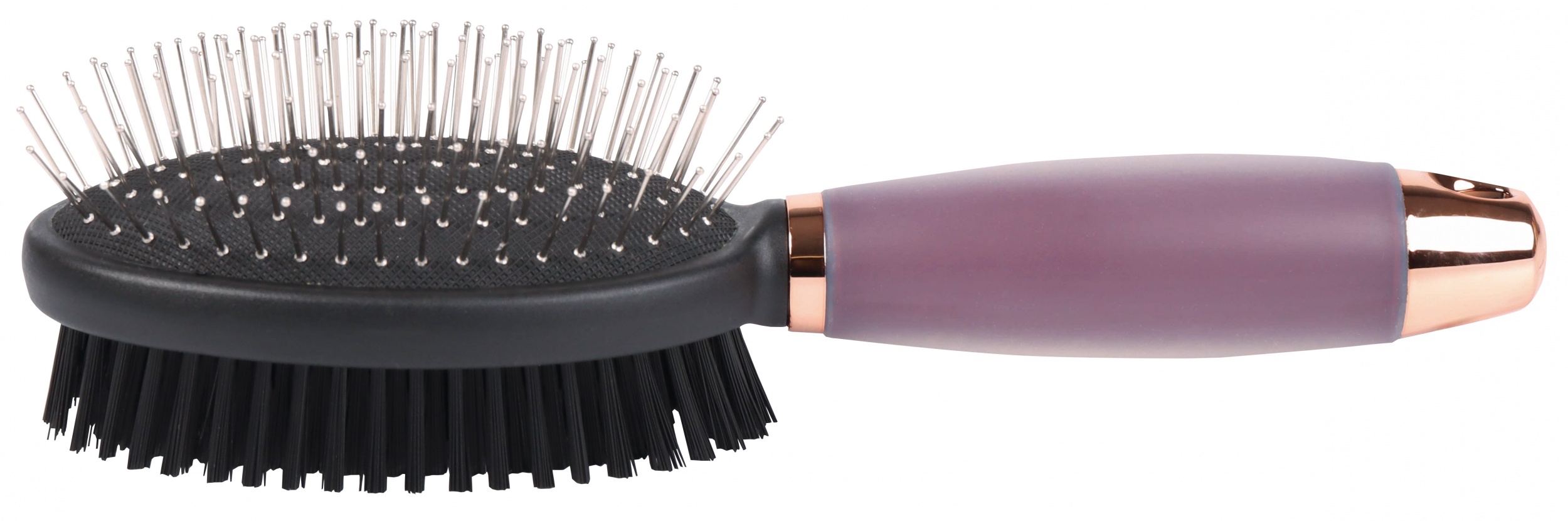Dubbele borstel met aan de ene kant nylon haren en een andere kant pinnen, inclusief fijne gelgrip.