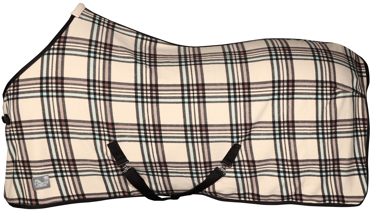 Fleecedeken met een frisse ruitprint en een subtiele glitterende bies. Voorzien van een enkele voorsluiting, kruissingels en een staartlus.
