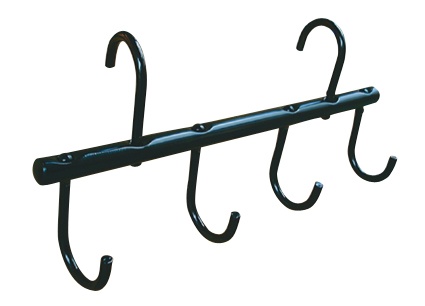 Stang van ongeveer 43 cm. lang, bovenaan de stang zitten twee haken om de stang op te hangen, en onderaan de stang zitten 4 haken om spullen aan op te hangen. Haken zijn ongeveer 7 cm. Breedte 43cm. Kleur: zwart