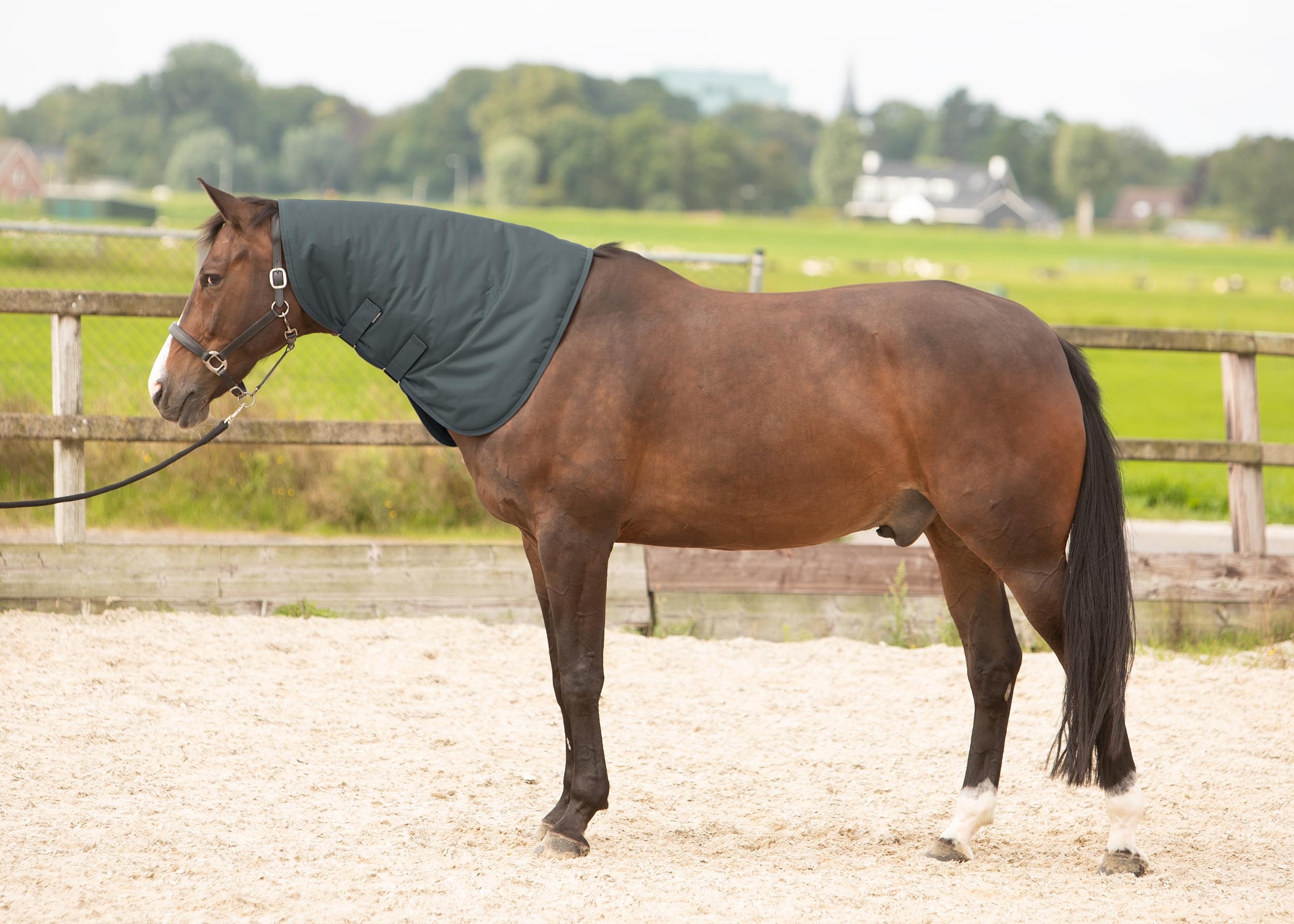 Naadloos halsdeel van waterdicht en ademend 600d ripstop. Drie klittenbandsluitingen bevestiging aan de deken. Voering met polyester tegen het afschuren van de manen. Vulling is 200g polyfill. Materiaal: - Buitenstof: 600d ripstop polyester - Voering: 100% polyester