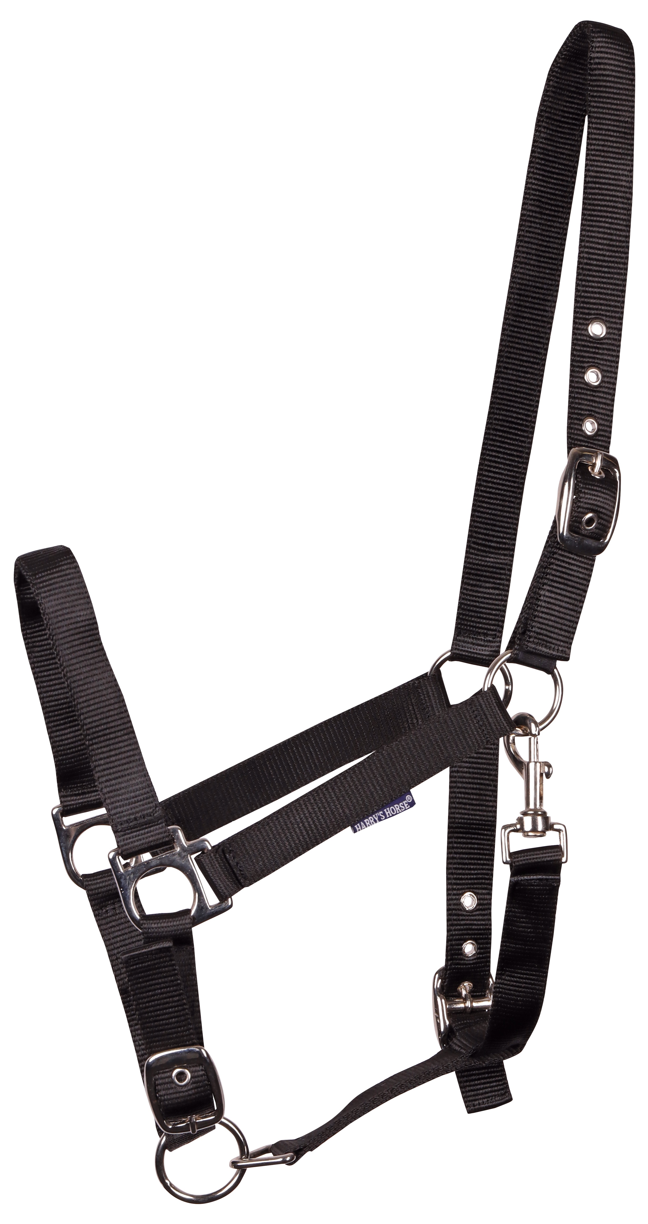 Halster met zilverkleurige fournituren. Verstelbaar op drie plaatsen: bij de hals, keel en de kaak. Gaatjes zijn voorzien van ringen. Materiaal: polypropyleen.