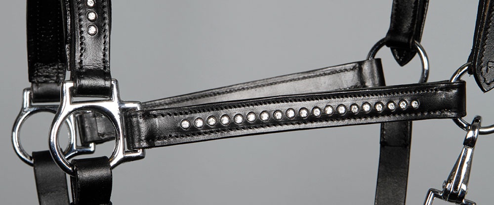Leder halster met crystallen op de neus en bakstukken, verstelbaar aan het kopstuk (dubbel) en onder de kin