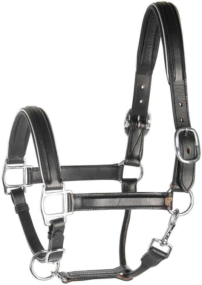 Mooi lederen halster met zilveren of goude bies, verstelbaar aan 1 zijde van het hoofd en op de kin. Verchroomde fournituren.