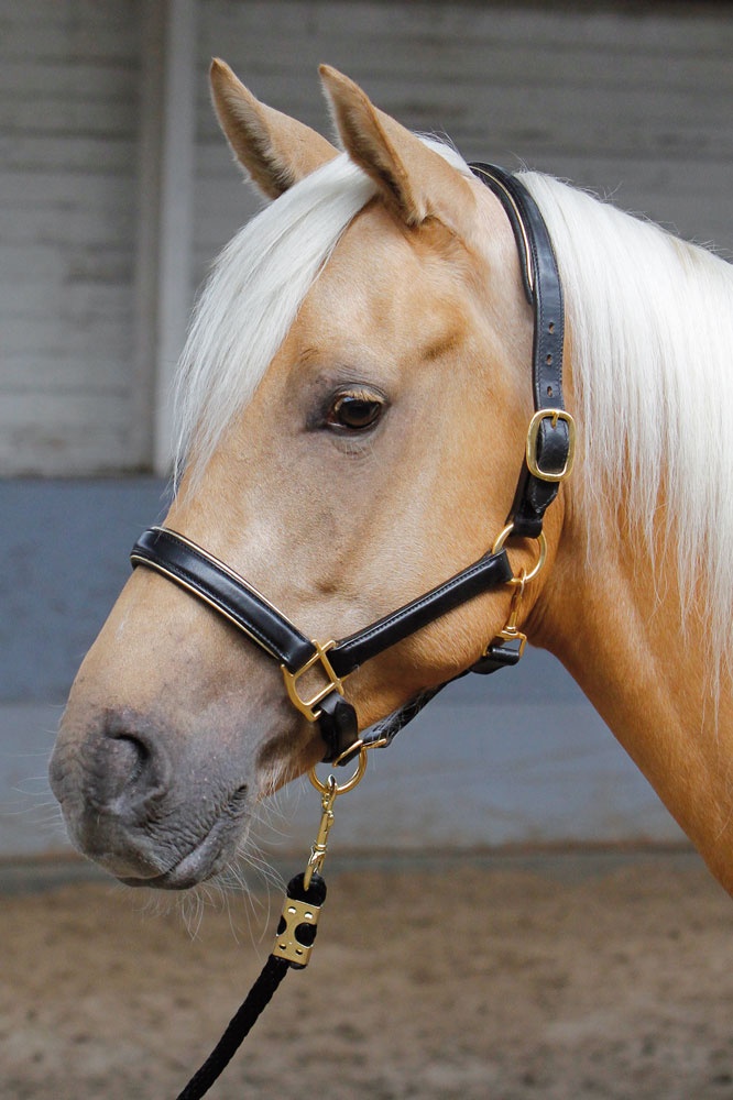 Mooi lederen halster met zilveren of goude bies, verstelbaar aan 1 zijde van het hoofd en op de kin. Verchroomde fournituren.