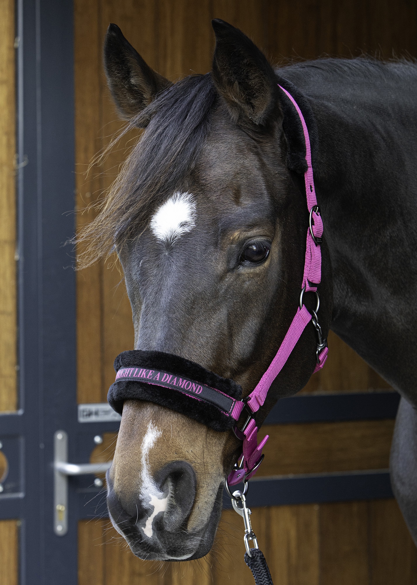 Halster met grappige tekst. Onderlegd met zacht zwart kunstbont. Verstelbaar aan beide kanten van het kopstuk en aan de kaak. De gaatjes zijn voorzien van oogjes. Zwart: PARTNER IN CRIME Navy: BORN 2 RIDE Roze: GIRL POWER Lime: HEY BIG SPENDER Lila: IT'S A KIND OF MAGIC Fuchsia: SHINE BRIGHT LIKE A DIAMOND