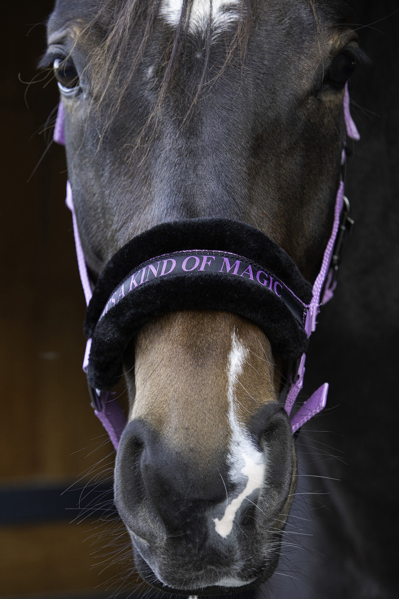 Halster met grappige tekst. Onderlegd met zacht zwart kunstbont. Verstelbaar aan beide kanten van het kopstuk en aan de kaak. De gaatjes zijn voorzien van oogjes. Zwart: PARTNER IN CRIME Navy: BORN 2 RIDE Roze: GIRL POWER Lime: HEY BIG SPENDER Lila: IT'S A KIND OF MAGIC Fuchsia: SHINE BRIGHT LIKE A DIAMOND