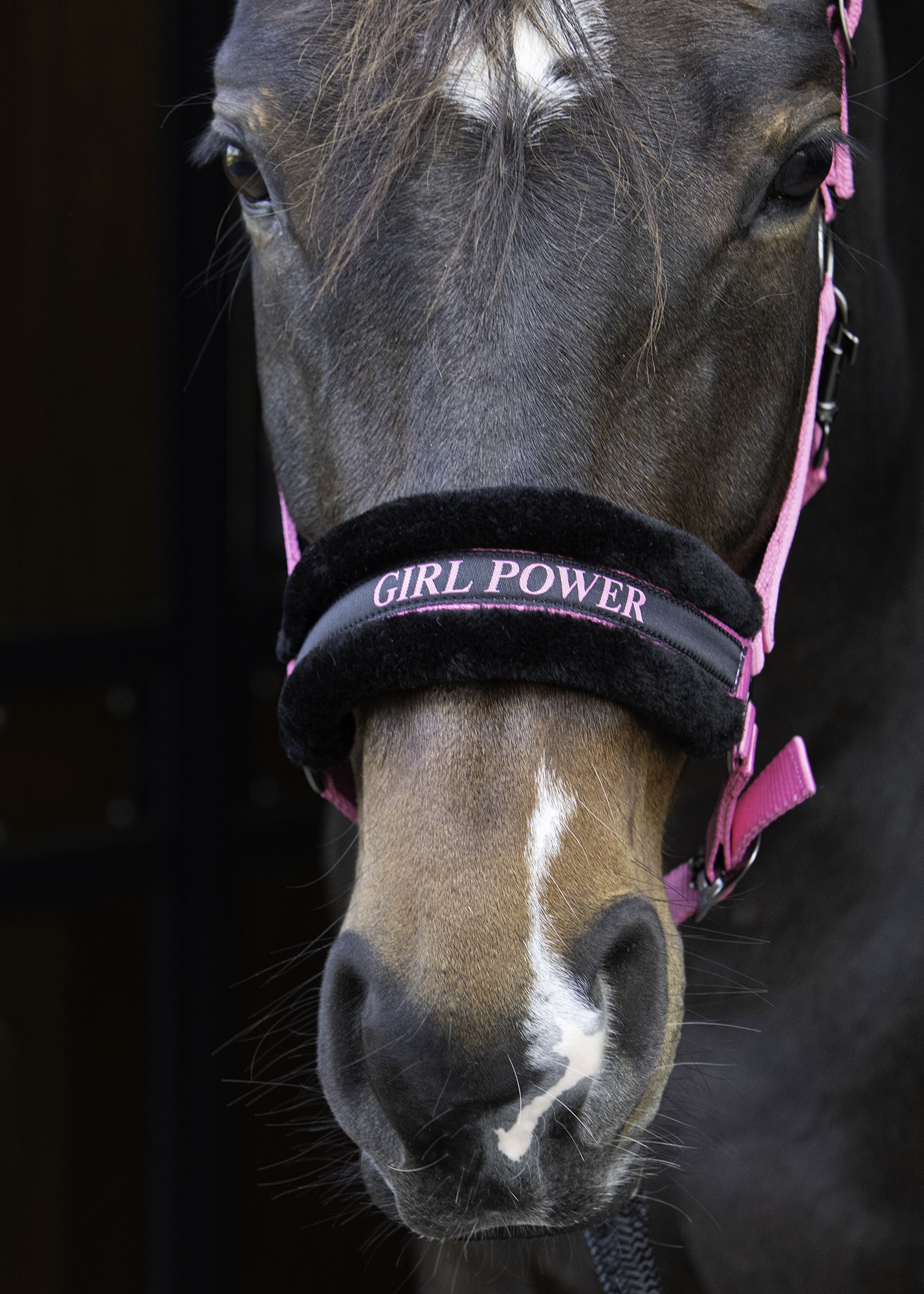 Halster met grappige tekst. Onderlegd met zacht zwart kunstbont. Verstelbaar aan beide kanten van het kopstuk en aan de kaak. De gaatjes zijn voorzien van oogjes. Zwart: PARTNER IN CRIME Navy: BORN 2 RIDE Roze: GIRL POWER Lime: HEY BIG SPENDER Lila: IT'S A KIND OF MAGIC Fuchsia: SHINE BRIGHT LIKE A DIAMOND