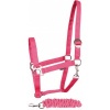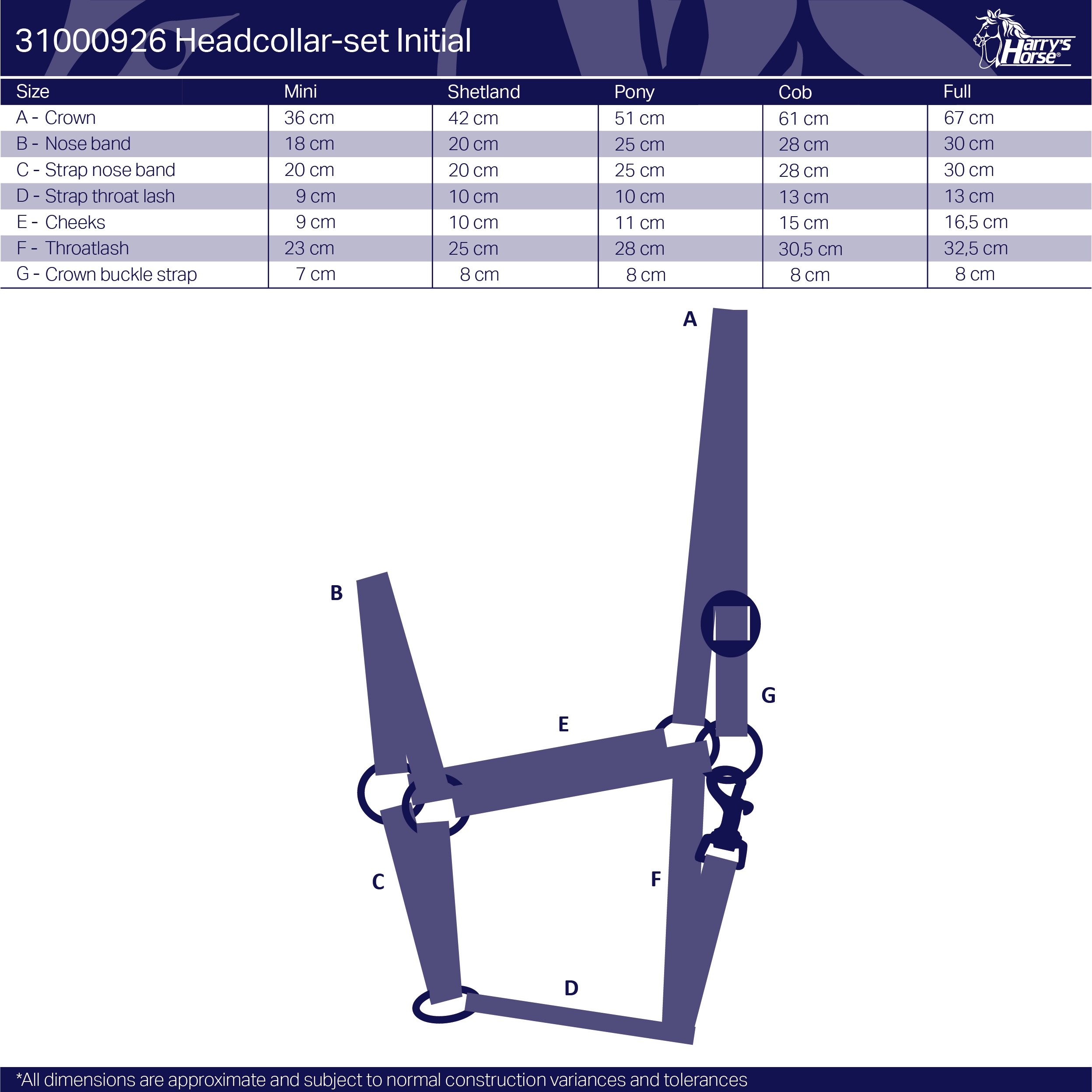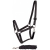 Opties Basis halsterset met zilverkleurige fournituren. Het halster is verstelbaar op kopstuk door middel van een schuifgesp. Lengte halstertouw is 180cm. Materiaal: Halster: polypropyleen Halstertouw: katoen