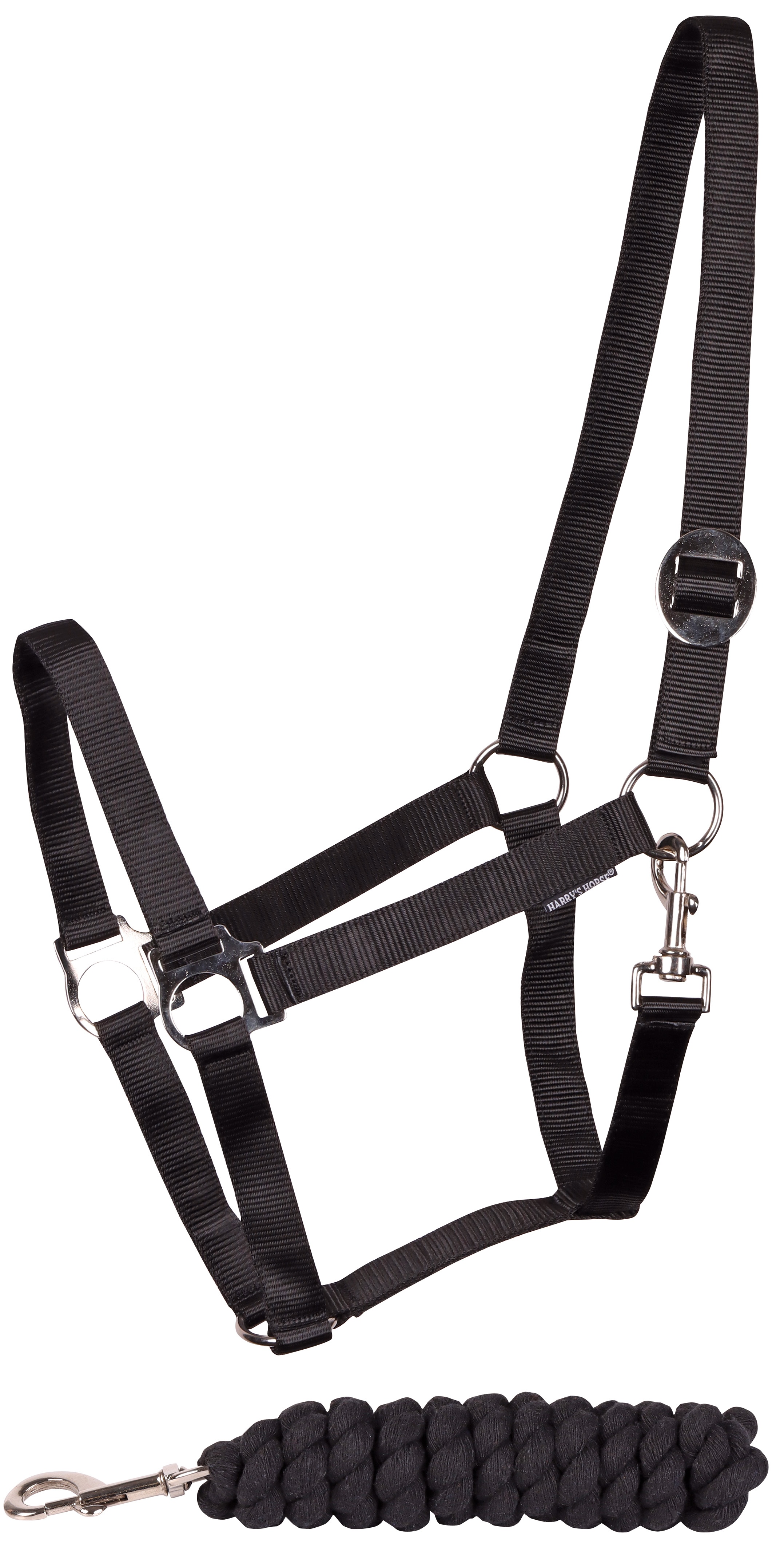 Opties Basis halsterset met zilverkleurige fournituren. Het halster is verstelbaar op kopstuk door middel van een schuifgesp. Lengte halstertouw is 180cm. Materiaal: Halster: polypropyleen Halstertouw: katoen