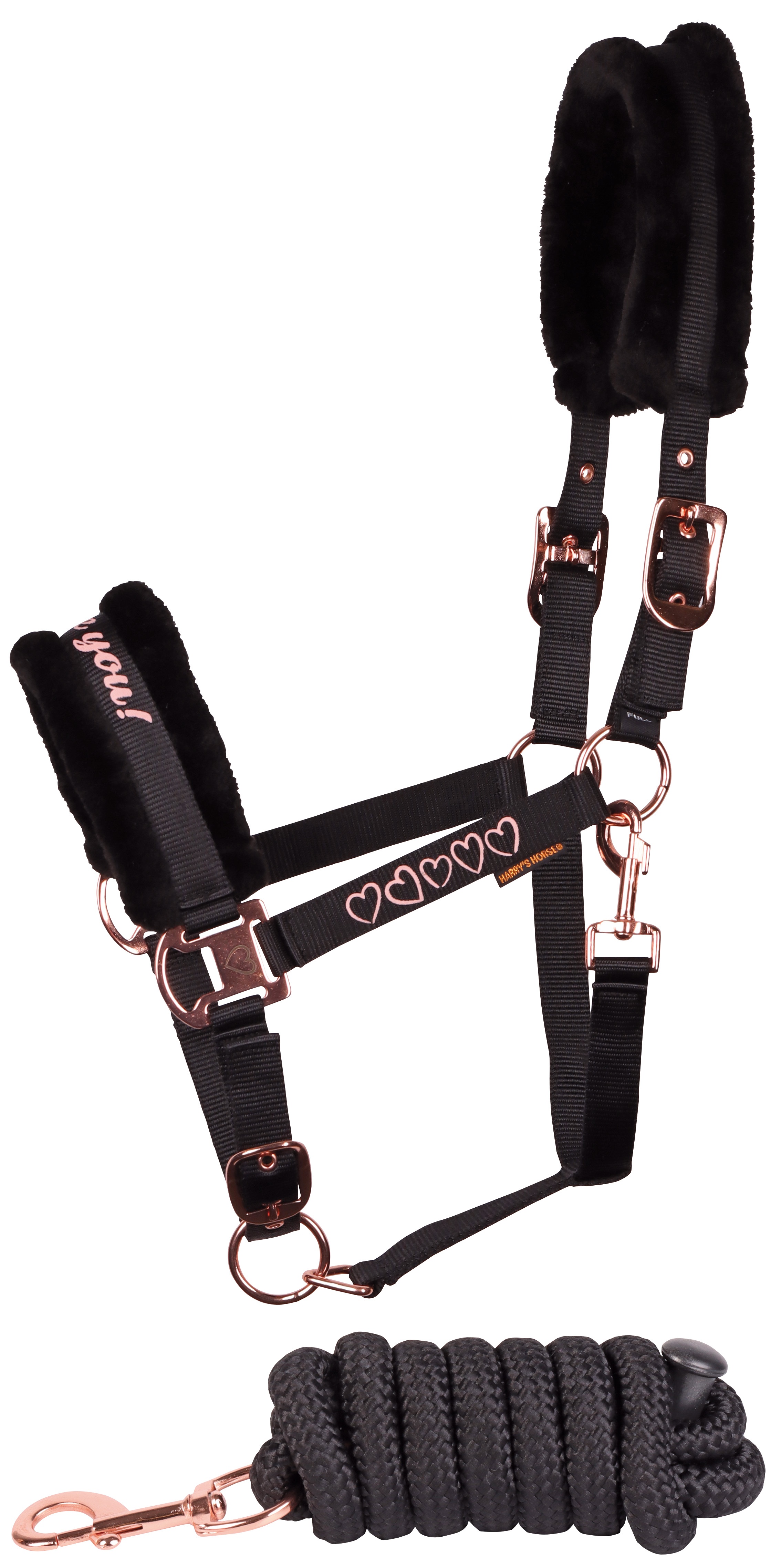 Opties Halster met "I love you" tekst en op de bakstukken en fournituren een print met hartjes. Onderlegd met kunstbont. Verstelbaar aan beide kanten van het kopstuk en aan de kaak. De gaatjes zijn voorzien van oogjes. Inclusief een 2 meter halstertouw.
