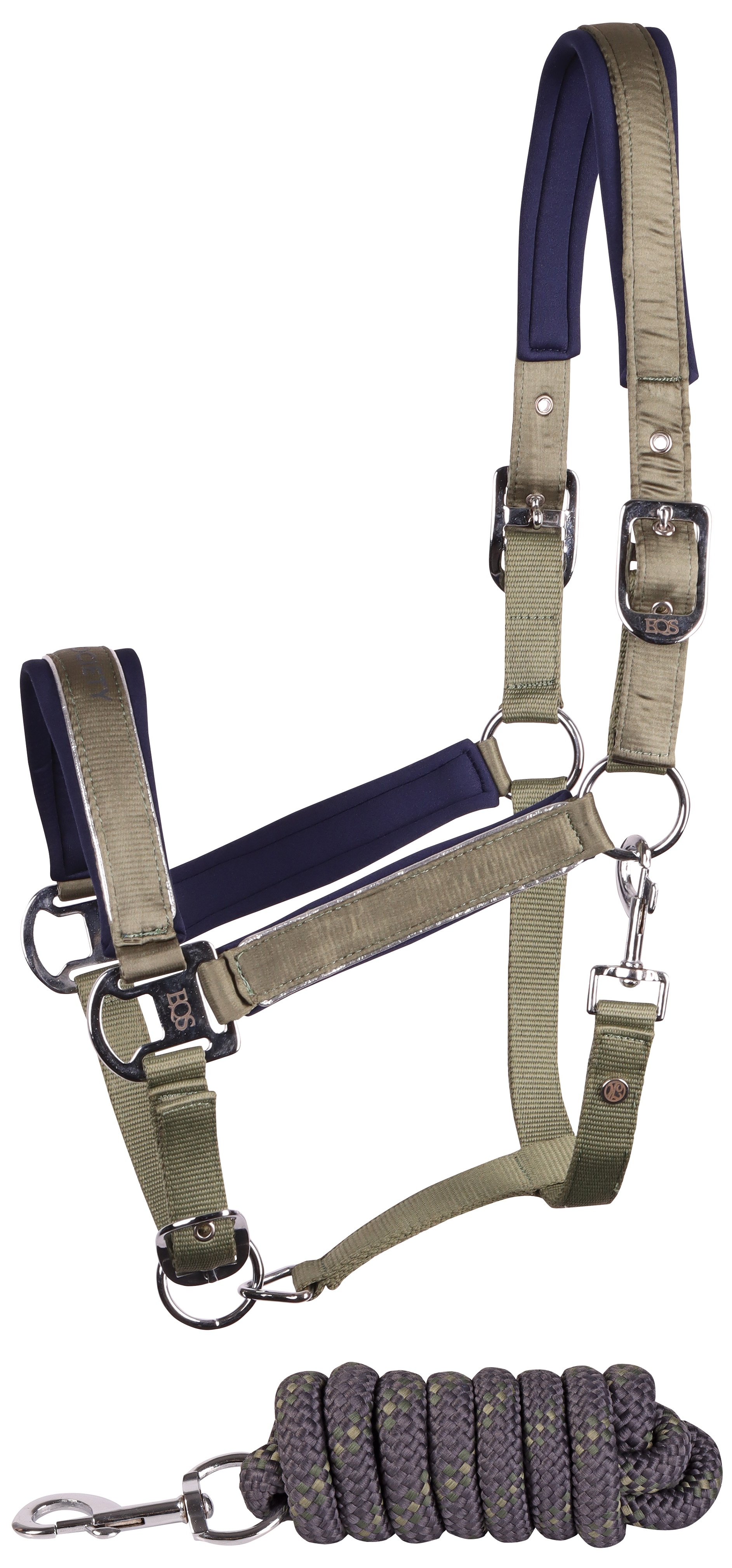 Halsterset met satijn bekleed en een glitter piping op de neus en kaakstukken, neopreen onderlegd, verstelbaar aan twee kanten van het kopstuk en op de neus, inclusief een halstertouw van 2 meter lengte. Materiaal; 100% polyester.