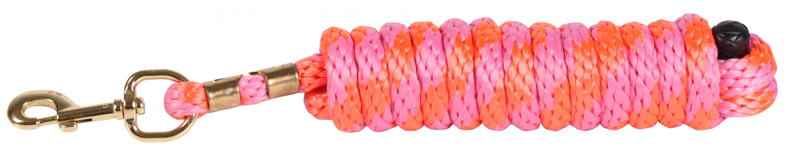 Extra lange, gevlochten halstertouw met goudkleurige musketon. Lengte: 300cm. Materiaal: polypropyleen.