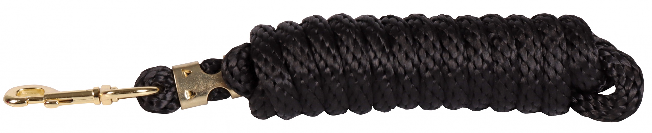 Extra lange, gevlochten halstertouw met goudkleurige musketon. Lengte: 300cm. Materiaal: polypropyleen.