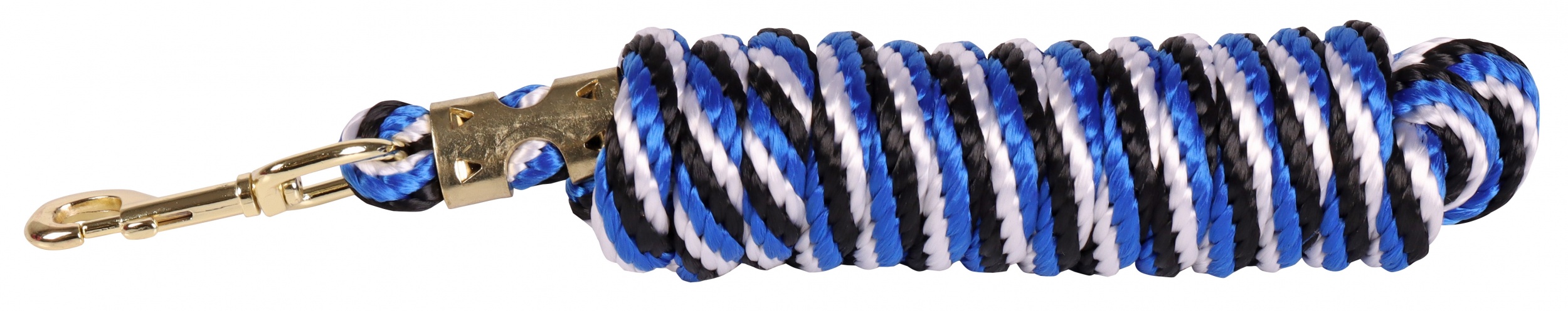 Extra lange, gevlochten halstertouw met goudkleurige musketon. Lengte: 300cm. Materiaal: polypropyleen.
