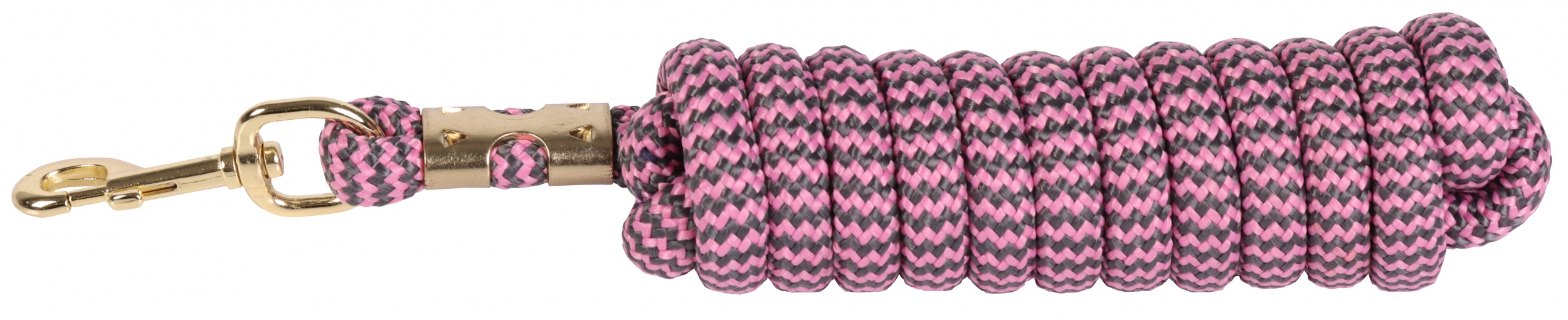 Extra lange, gevlochten halstertouw met goudkleurige musketon. Lengte: 300cm. Materiaal: polypropyleen.