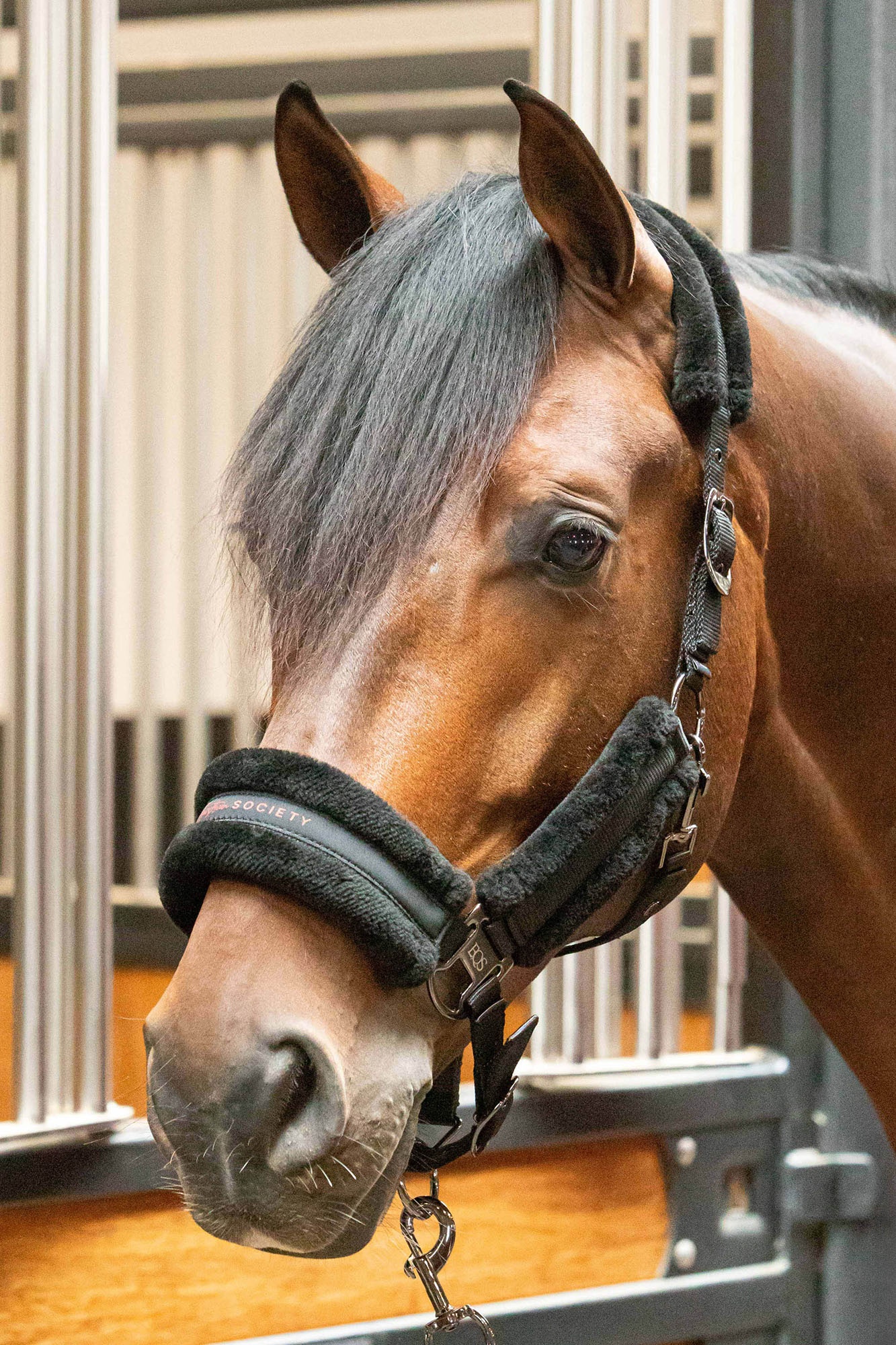 Halsterset met Equestrian Society logo op de neus, met zacht kunstbont onderlegd, verstelbaar aan twee kanten van het kopstuk en op de neus, inclusief een halstertouw van 2 meter lengte. 100% polyester.