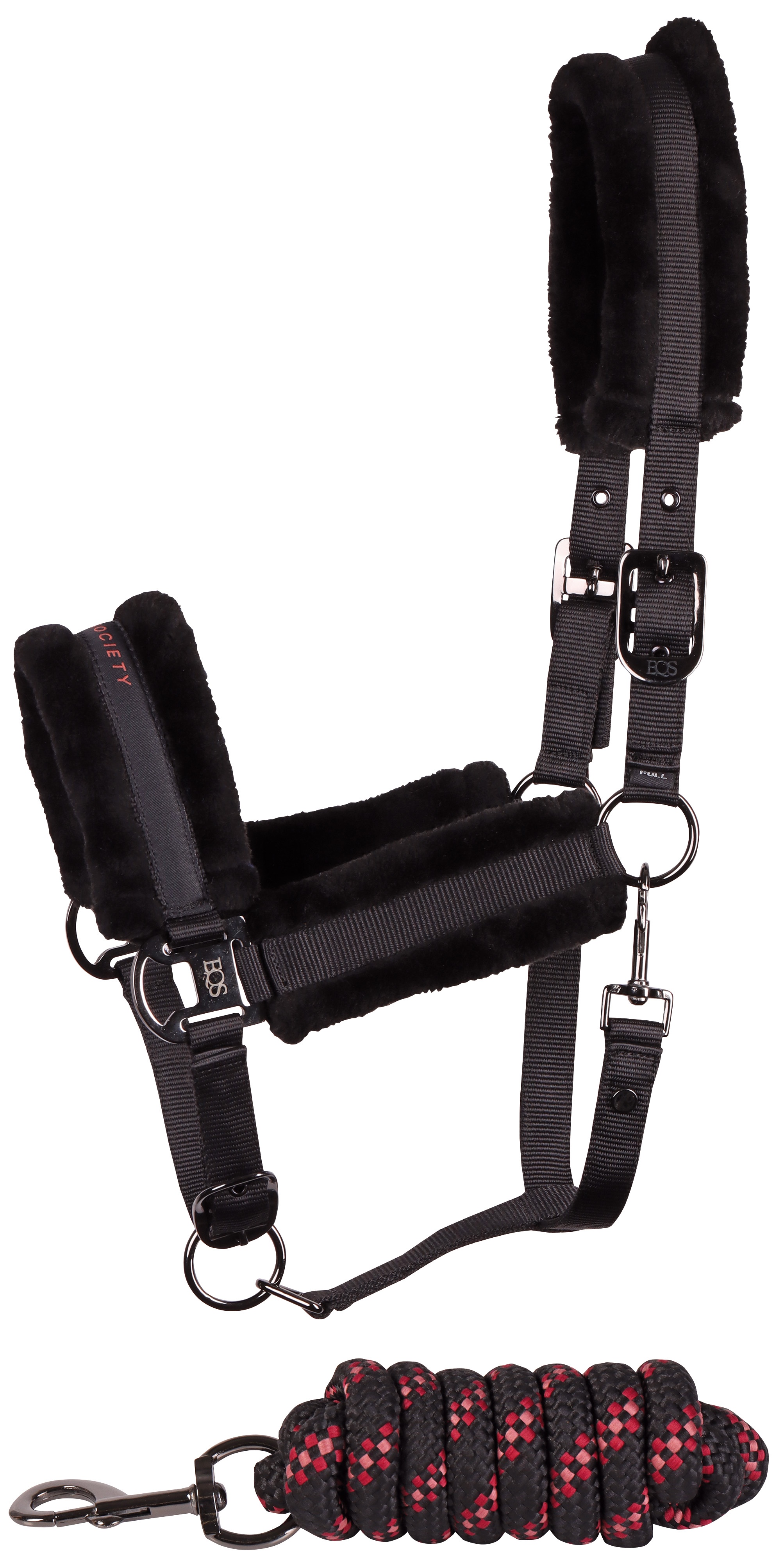 Opties Halsterset met Equestrian Society logo op de neus, met zacht kunstbont onderlegd, verstelbaar aan twee kanten van het kopstuk en op de neus, inclusief een halstertouw van 2 meter lengte. 100% polyester.