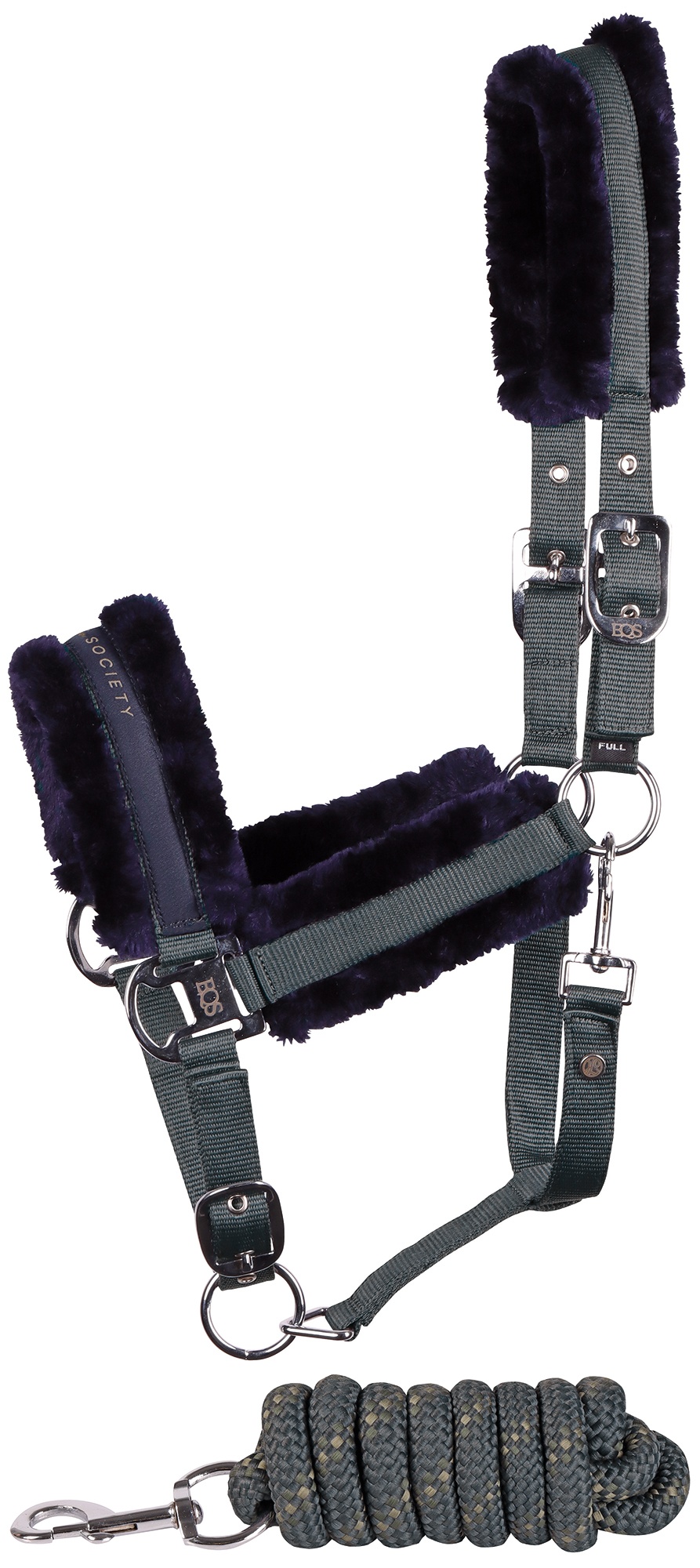 Halsterset met Equestrian Society logo op de neus, met zacht kunstbont onderlegd, verstelbaar aan twee kanten van het kopstuk en op de neus, inclusief een halstertouw van 2 meter lengte. 100% polyester.