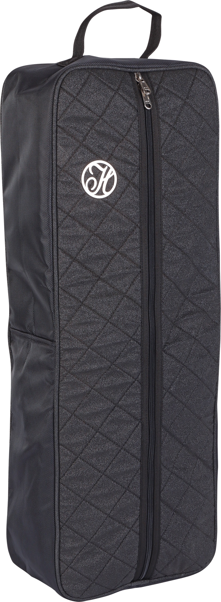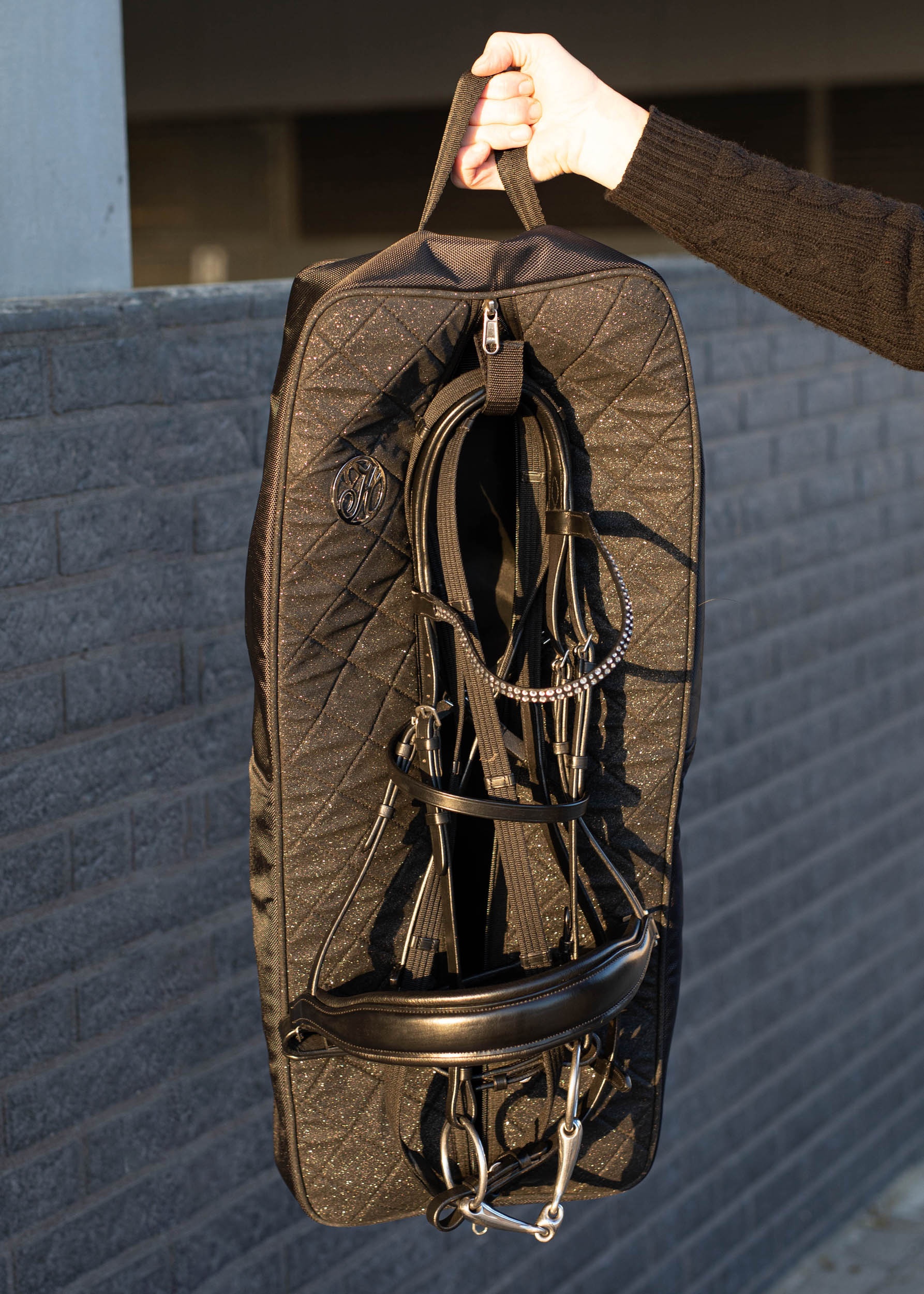 Luxe uitgevoerde tas voor je hoofdstel, uitgevoerd met schitterende glitterstof. Voorzien van 2-weg ritssluitingen en klittenband aan de binnen bovenzijde om het hoofdstel in op te hangen. Afmetingen: 25x16x74 cm Materiaal tas: 600D polyester