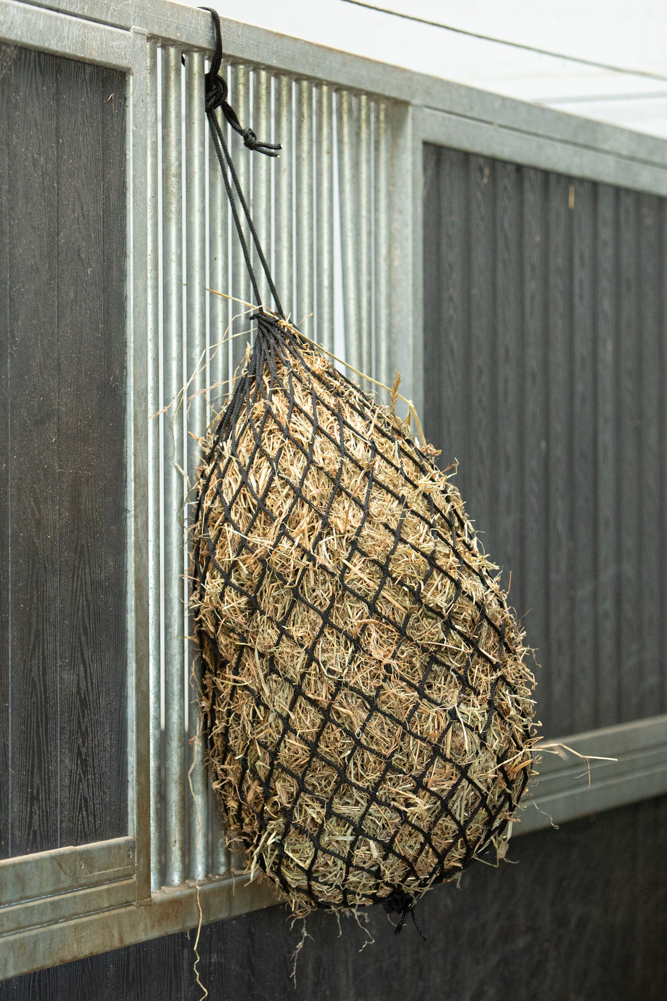 Een knooploos hooinet is zachter en comfortabeler voor het paard doordat het geen harde knopen heeft die kunnen schuren of drukpunten veroorzaken. Dit helpt irritaties aan lippen, tong en neus te voorkomen. Dankzij het knooploze ontwerp is het materiaal sterker en duurzamer, wat bijdraagt aan een langere levensduur. Ook voorkomt het onnodige slijtage aan de tanden. Het net is makkelijker te vullen, blijft beter in vorm en raakt minder snel in de knoop. Daarnaast bevordert het een langzamere voeropname en vermindert het hooiverspilling. Maasgrootte: 5x5 cm Afmetingen: 60x100cm