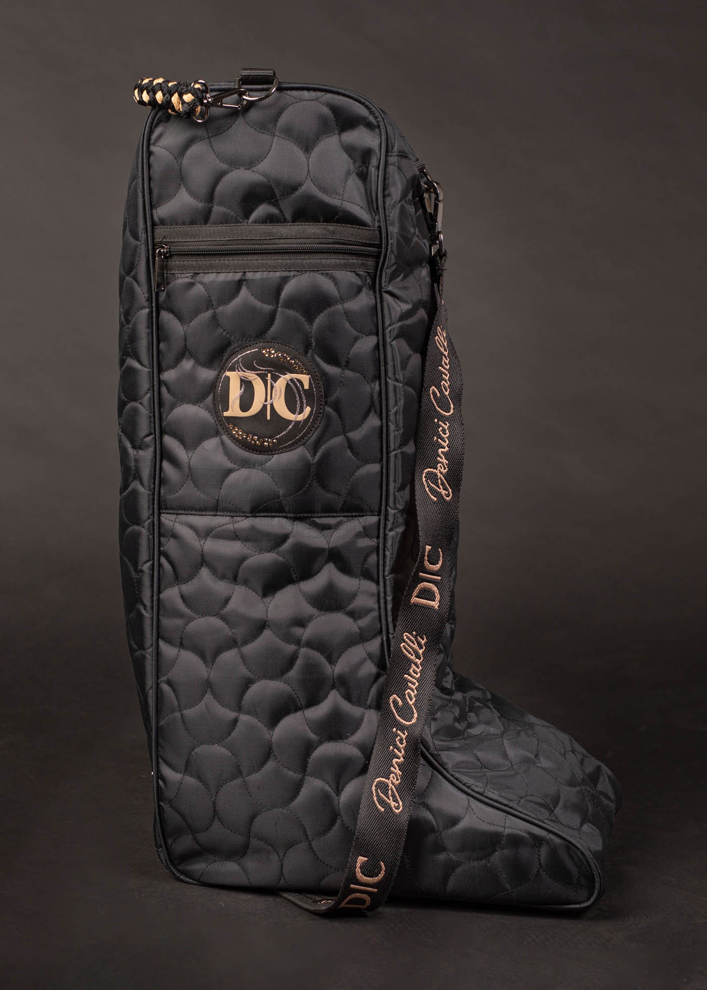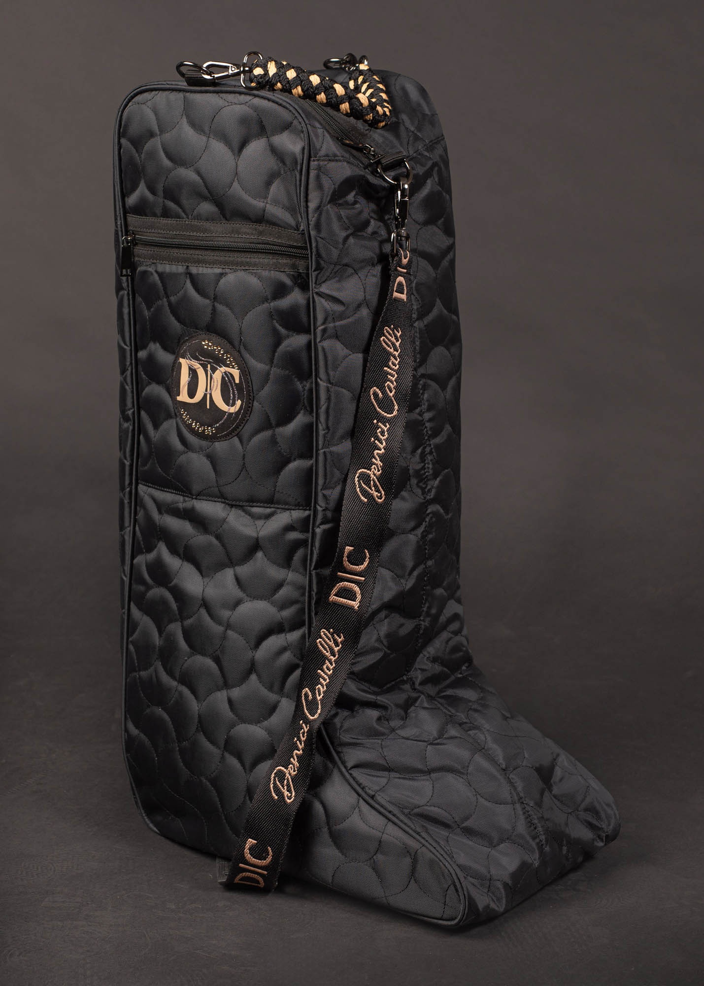Laarzentas met allover quilt, Denici Cavalli logo met kristallen, een opbergvak met rits aan de buitenkant, comfortabel handvat in zwart/beige, verstelbare schouderband met het Denici Cavalli logo, stoffen tussenschot aan de binnenkant en kunststof noppen aan de onderkant. Afmeting 57x35x23 cm Materiaal: 100% polyester.