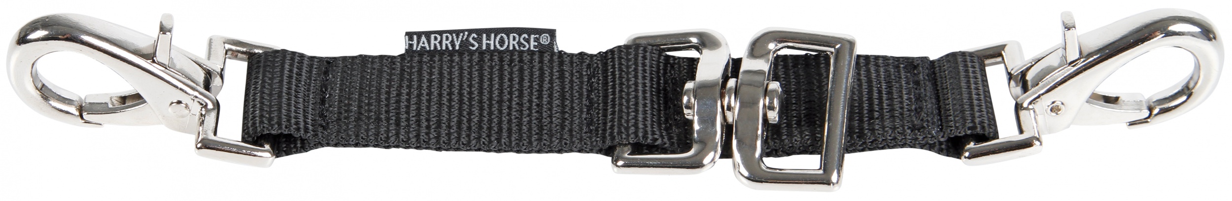 Koppelstuk voor bij het longeren. Bevestiging door middel van musketon aan bit of halster. In het midden een vrijdraaiende ring. Fournituren zijn zilverkleurig. Lengte polyester: 16cm.