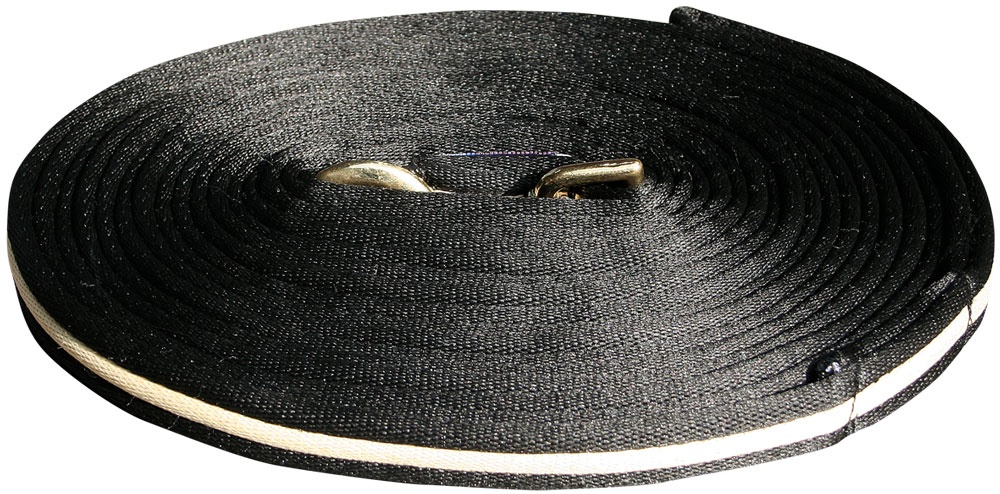Soft longeerlijn met vrijdraaiende muskaton en lus aan einde. Lengte 8 meter. Verpakt in transparant opbergtas met rits. Materiaal: soft polyester