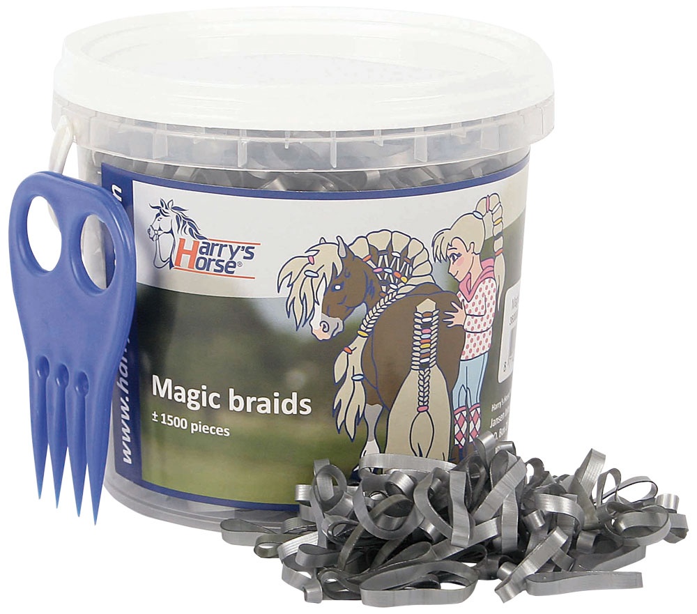 Superleuke elastiekjes voor het invlechten van de manen. Extra sterk, flexibel en herbruikbaar! Wordt geleverd in handig potje incl. manenkam. Ong. 1500 elastiekjes per potje (1 liter)