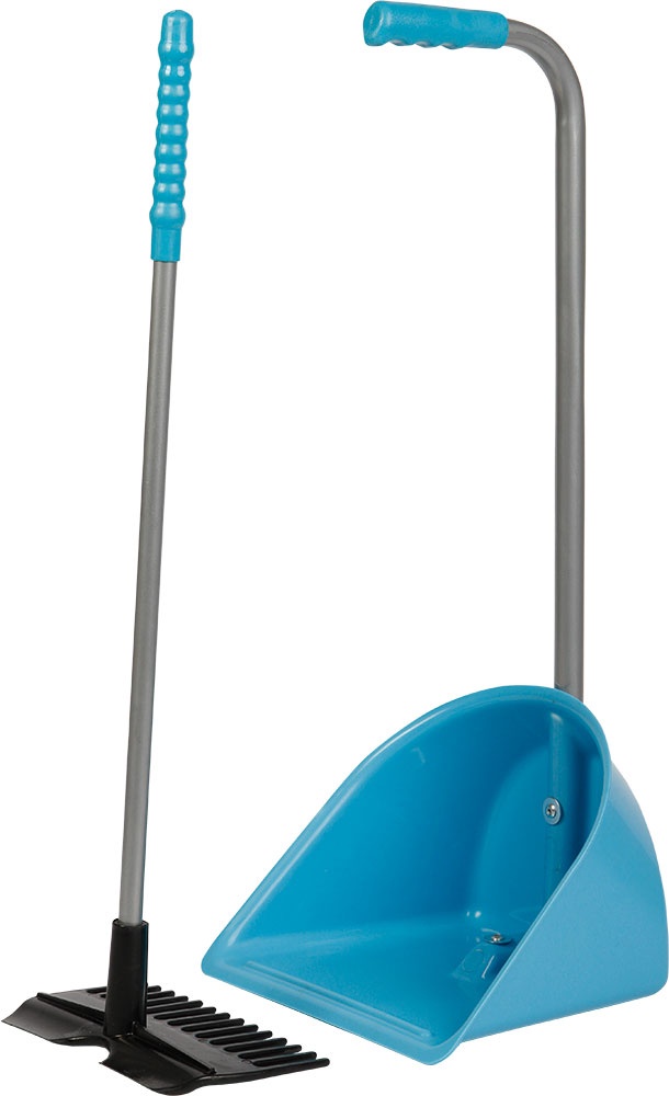 Opties Ideaal voor op stal, onmisbaar voor in de trailer. Stabiele verzamelbak (kunststof) en handige mestvork (kunststof, metaal). Complete set bestaand uit bak en hark.Door de aangepaste hoogte uitermate geschikt voor kinderen. Bak 25x21x18cm, 62cm hoog, hark 62cm